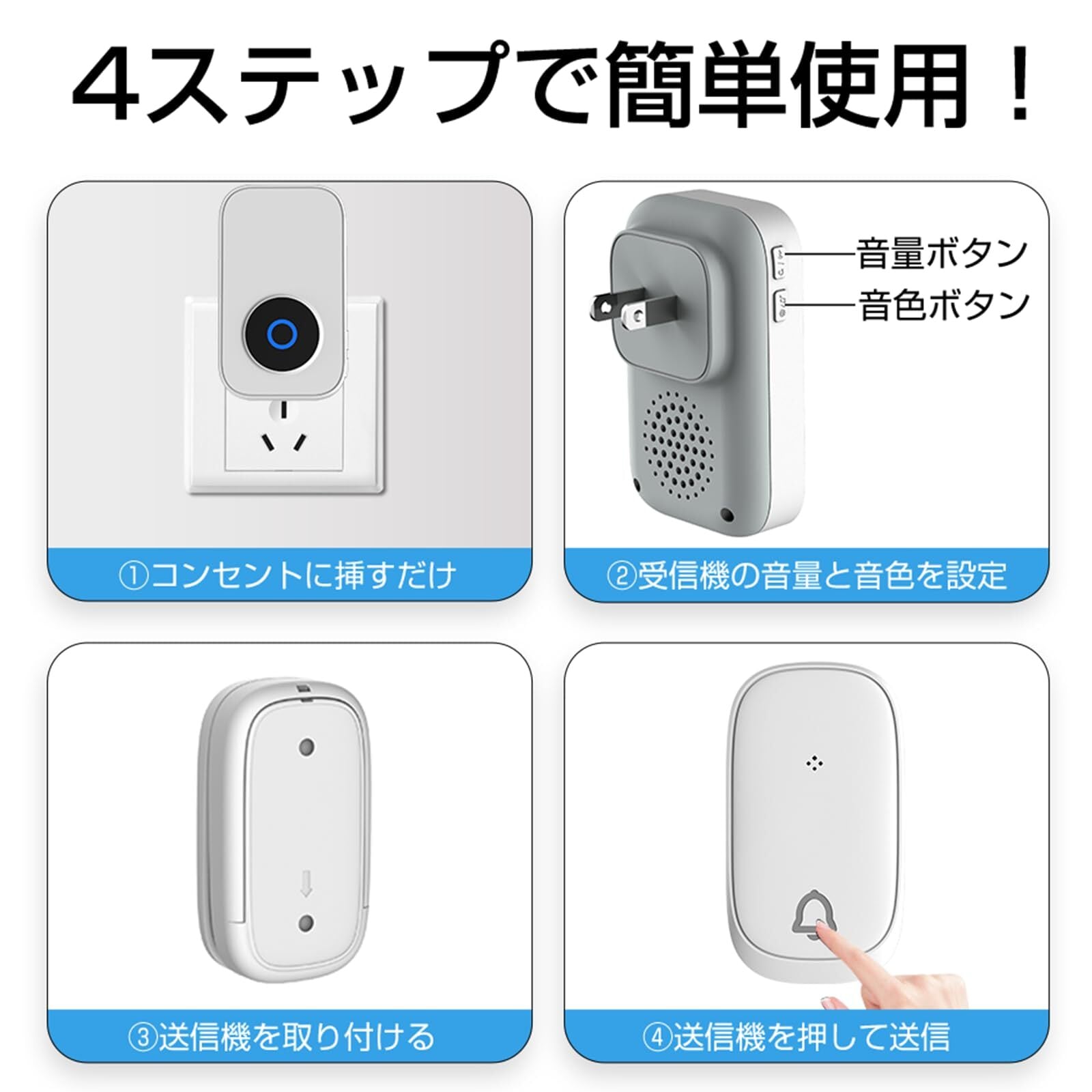 【38曲4段階音量調節可能のワイヤレスチャイム】このチャイムの発信機を押すと、受信機が音を立てながら青いライトが点滅してお知らせします。さらに38種類の曲と0-100DBの4段音量を調整することができます。使用したい場所やお好みに合わせてご使用ください。