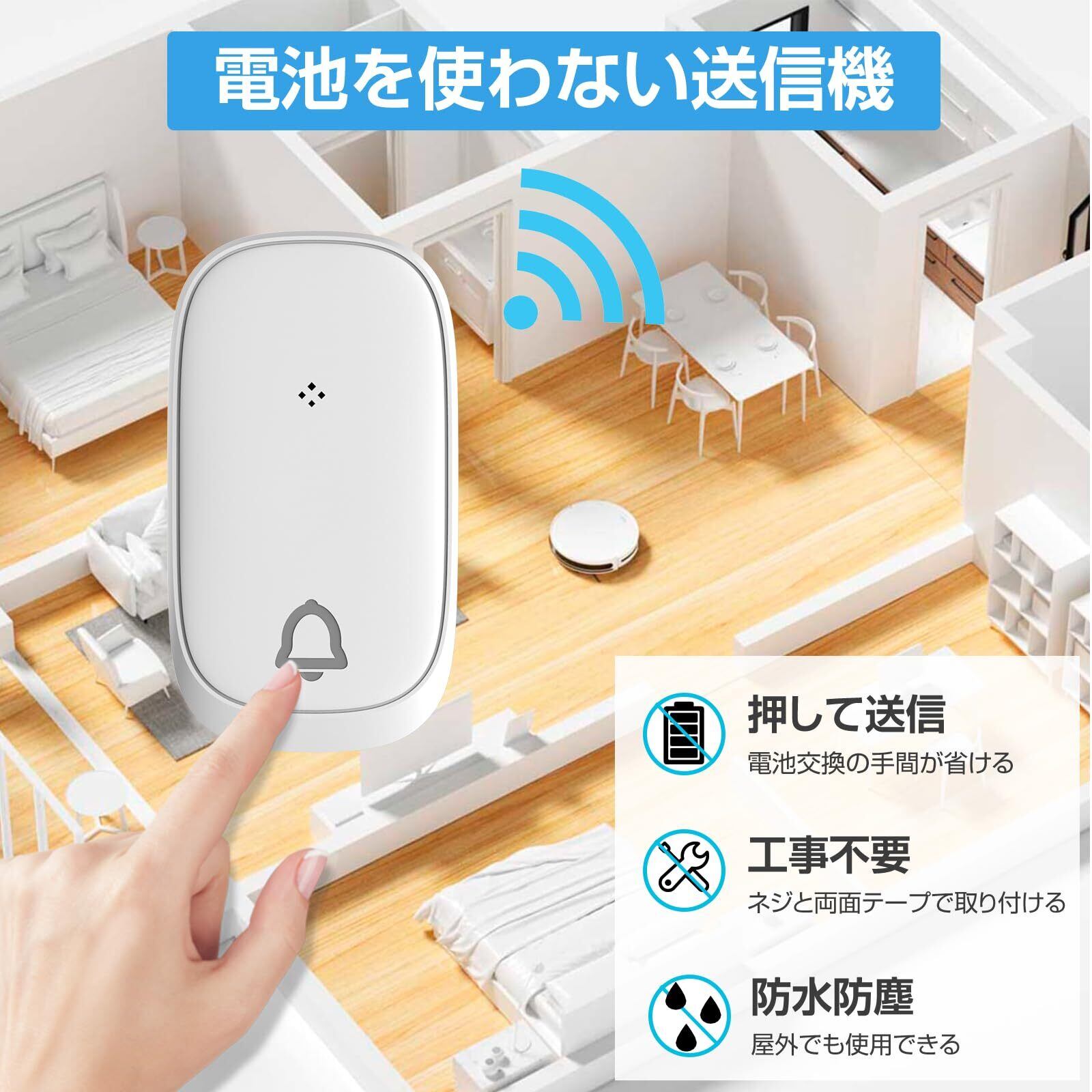 ワイヤレスチャイム ドアベル 自動発電 玄関チャイム 電池不要 防水防塵 工事不要 38曲 4段階音量調節 100db 光でお知らせ メモリー機能 ドアベル 介護/飲食店/玄関 150M範囲 二階も聞こえる 来客対応(1送信機+2受信機)