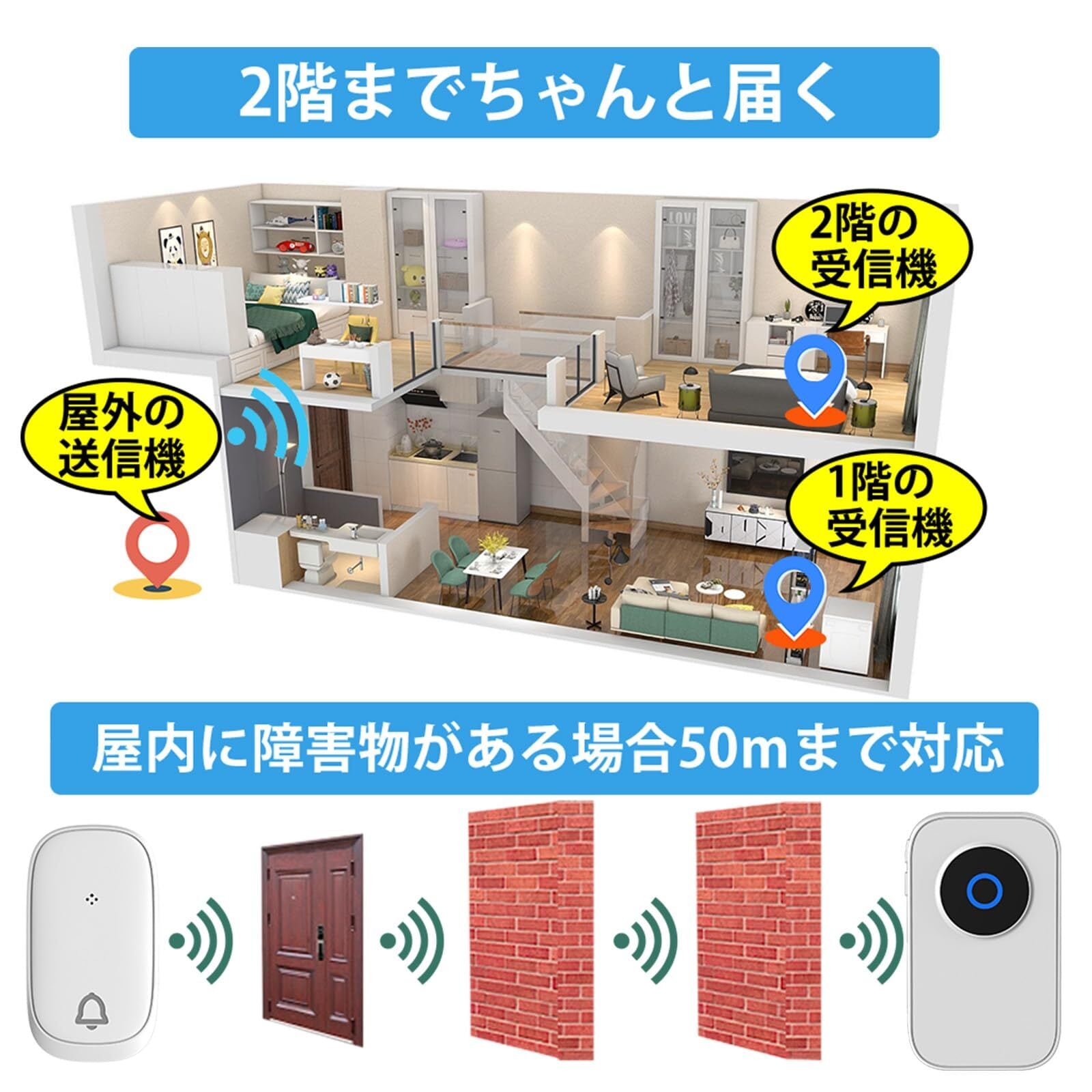 【150M範囲&安定受信】このドアチャイムは高感度の受信機と送信機を使用して、壁を通して安定的に利用することができます。屋内での使用はもちろん、2階建てでの使用も可能です。 また、送信機は大きな音を出すので、耳が悪い人でもすぐに気づくことができます。来客時の玄関チャイム、介護や御店での連絡や呼び出しに様々な場所にご利用できとして大活躍です。【より1年間の】何か不備な点がある場合は、ご遠慮無くお問い合わせください。