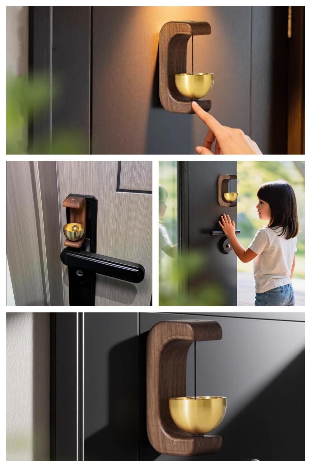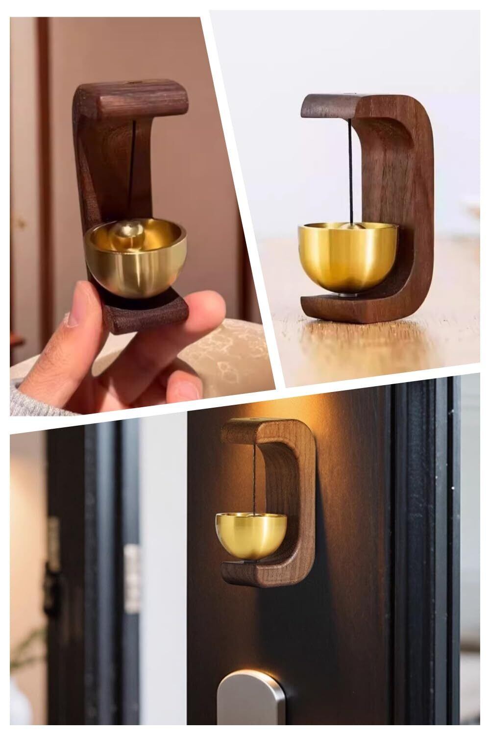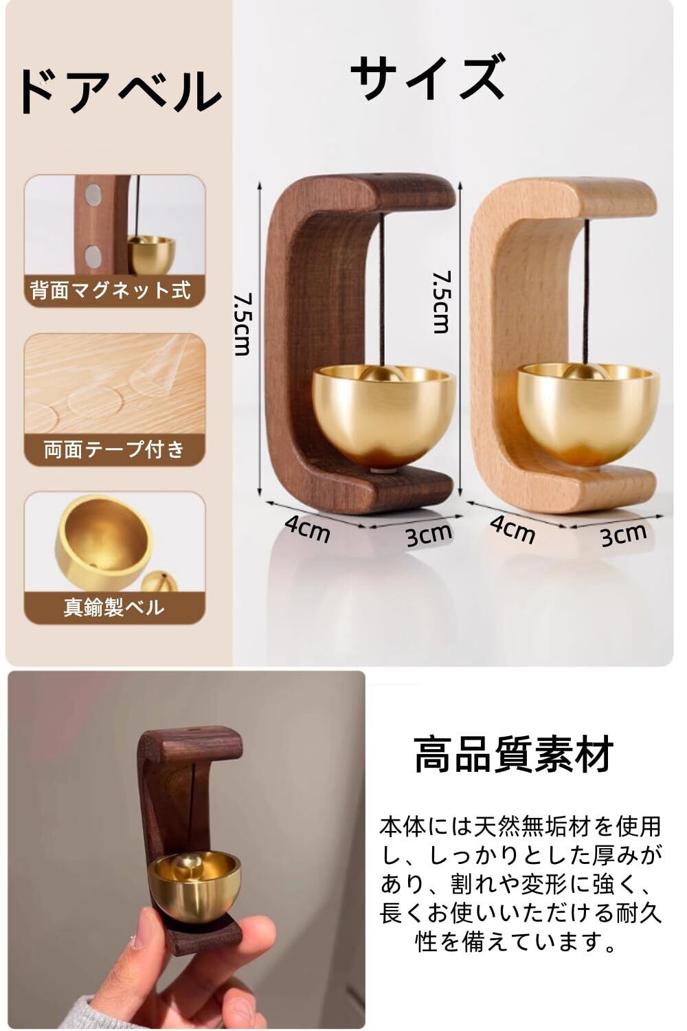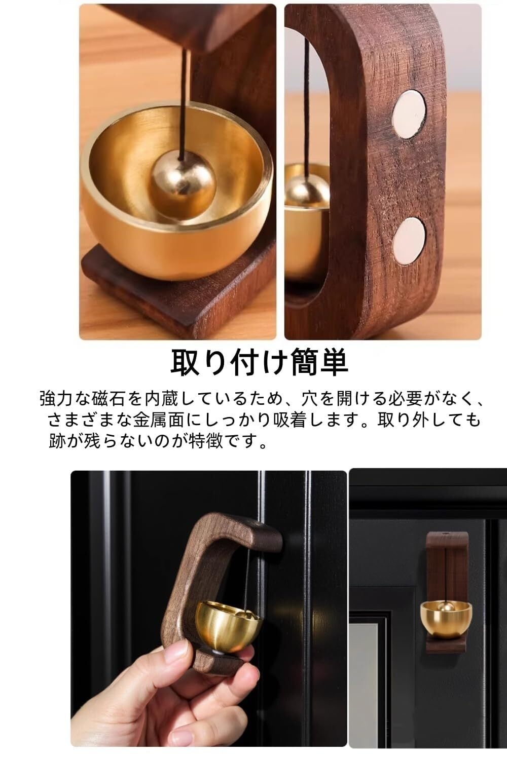 ウォールナットの素材を使用したこのドアベルは、自然な温かみと高級感を持っています。真鍮製の鈴は、優雅な音色を響かせ、訪問者を優しく迎え入れます。玄関や冷蔵庫、引き戸など、さまざまな場所にぴったりです。