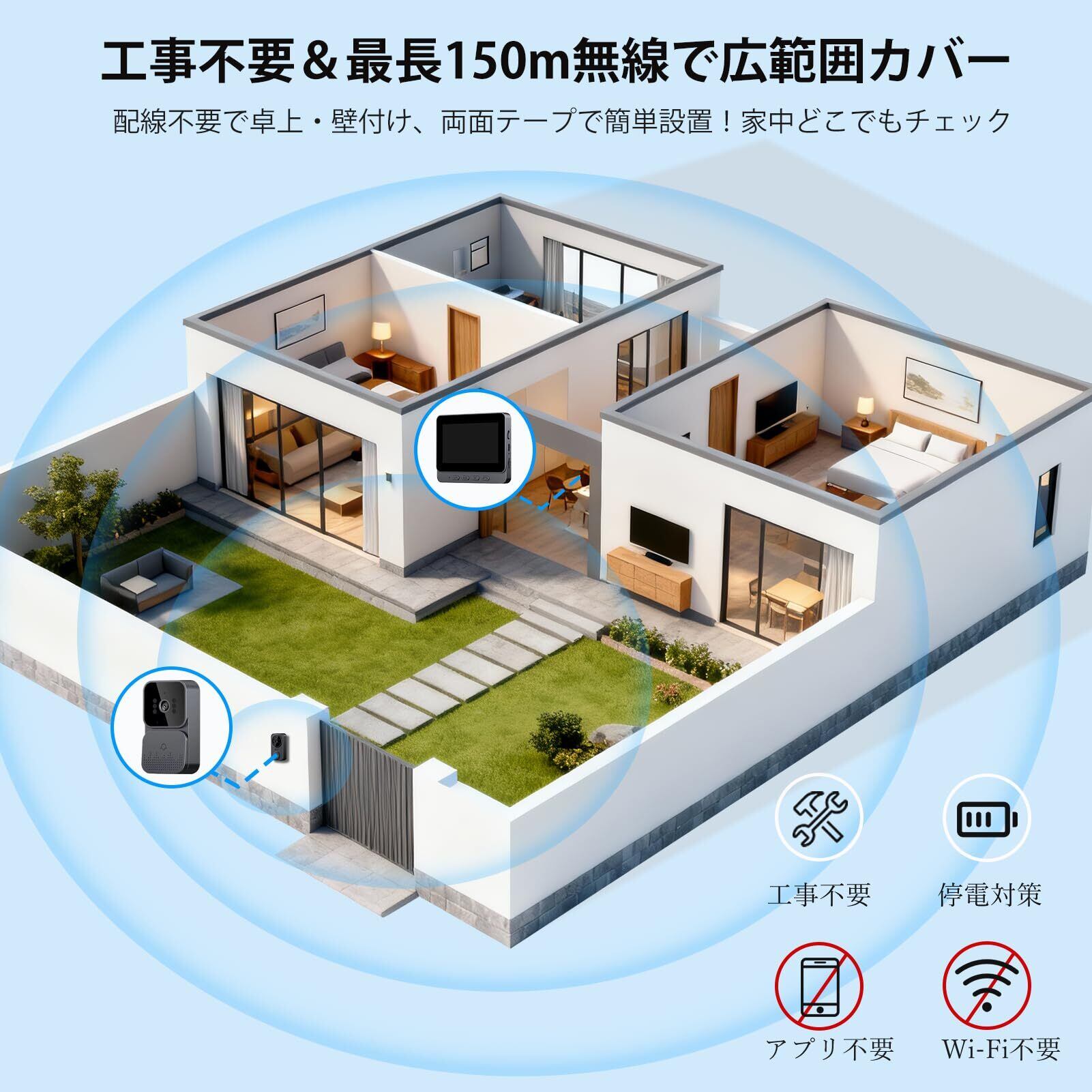 【双方向通話|配線不要で3通りの設置|6種類の報知音】子機・モニター親機ともにマイクを搭載し、来訪者とリアルタイムで双方向通話が可能なワイヤレスインターホン。手が離せないときや家事中でも応対でき、配達対応もスムーズです。6種類の報知音で好みに合わせ設定でき、配線工事不要で卓上・壁掛け・両面テープの3通りで簡単設置可能。玄関まで行く手間が減り、高齢者や子どもも安心して使え、防犯や宅配対応にも最適なワイヤレスドアホンです。