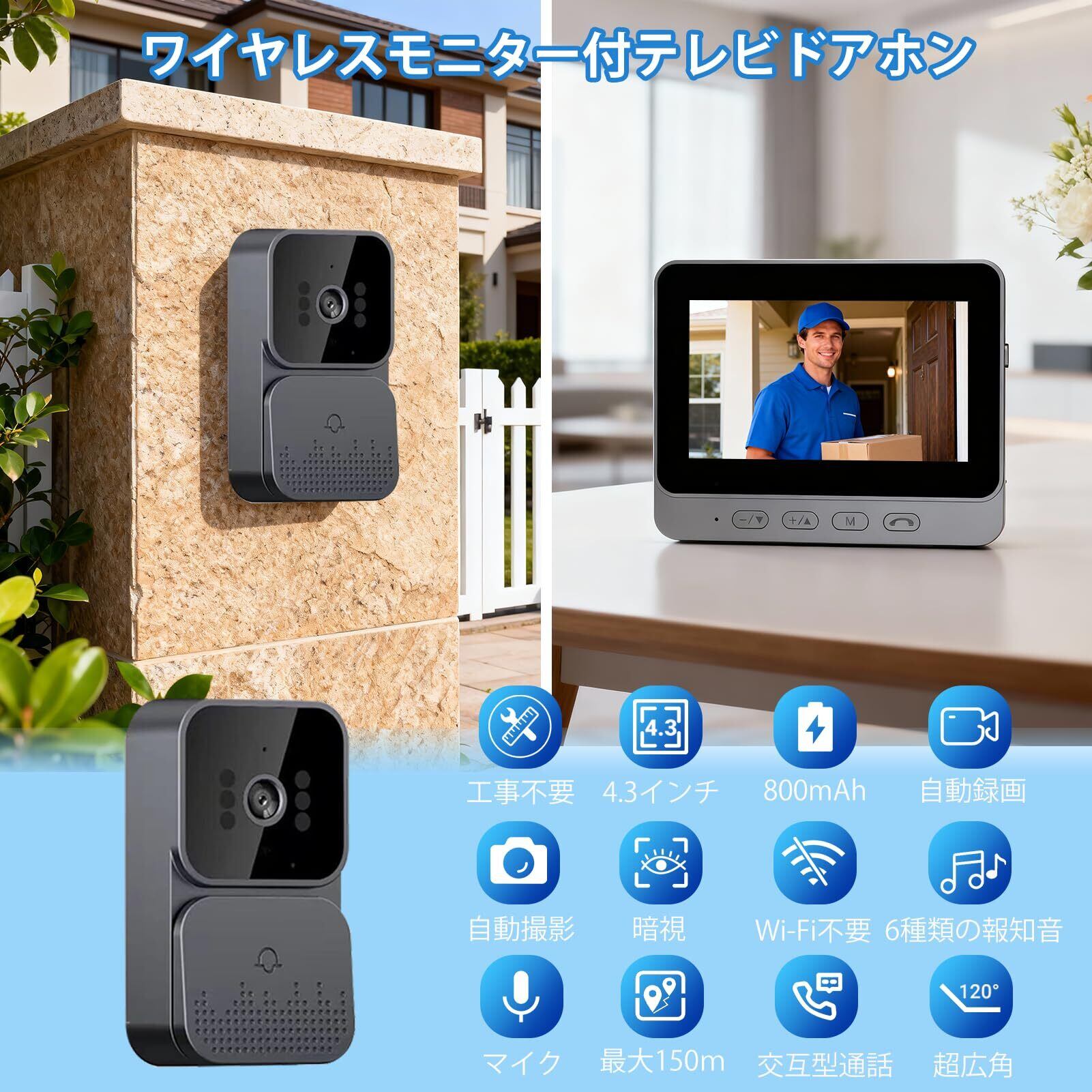 ZAIDER テレビドアホン インターホン カメラ付き ドアホン ワイヤレス 工事不要 【双方向通話/自動録画】 赤外線LED 暗視撮影 2.4Ghz無線 WI-FI不要 玄関チャイム USB充電 超広角 防犯カメラ 日本語説明書