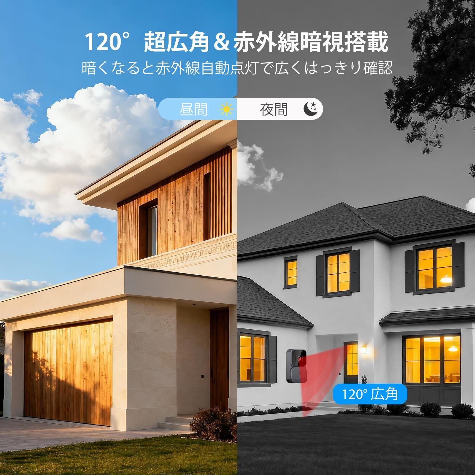 【赤外線LED搭載|120°広角レンズ】赤外線LEDライトを備えた120°広角カメラが、暗くなると自動で赤外線を点灯。4.3インチのワイドモニターで夜間でも来訪者の顔を鮮明に確認できます。狭いスペースでも広範囲をカバーでき、玄関はもちろん、店舗・事務所・受付など幅広い場所にドアベル・チャイム・防犯カメラとして簡単に設置可能です。録画映像の再生時には録画された日付・日時も確認でき、防犯対策にもおすすめのワイヤレスチャイムです。