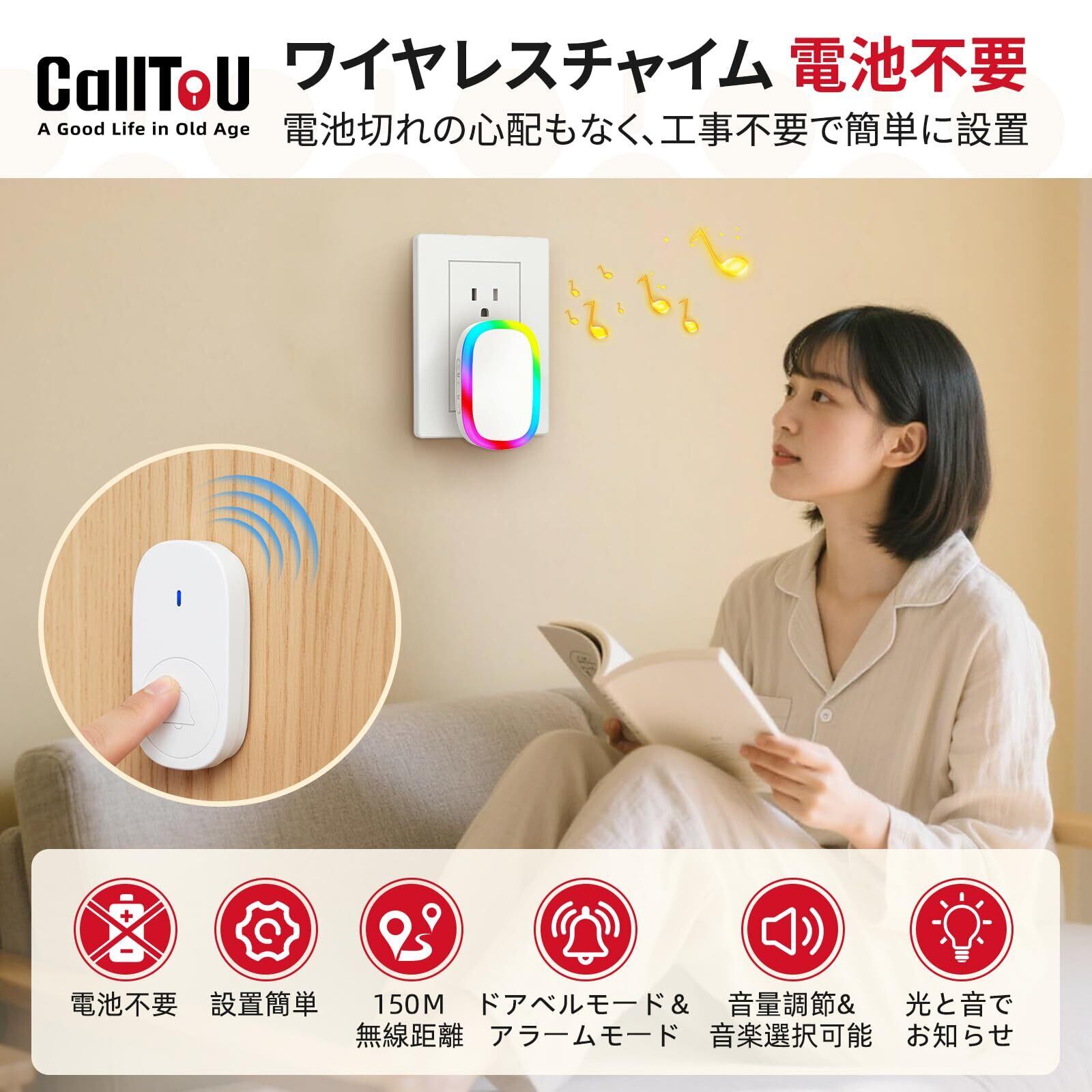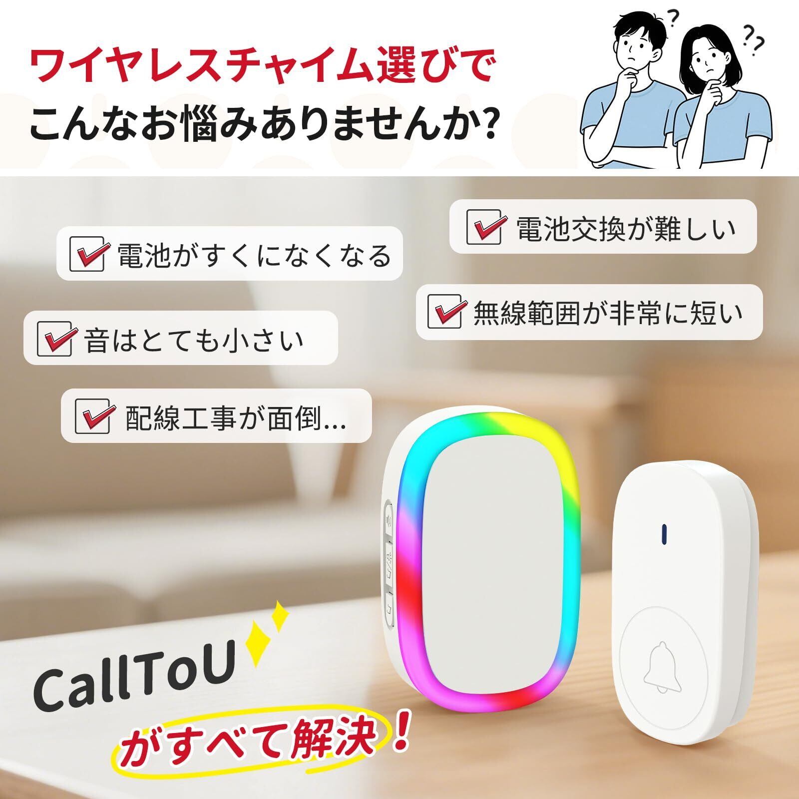 【人気商品】CallToU ワイヤレスチャイム 自動発電 玄関チャイム 電池不要 緊急警報/ドアベルモード 7色光でお知らせ 38曲 4段階音量 100dB 150m通信 防水防塵 メモリー機能 介護 店舗 家庭用 二階も聞こえる 来客対応(2T1,ホワイト)