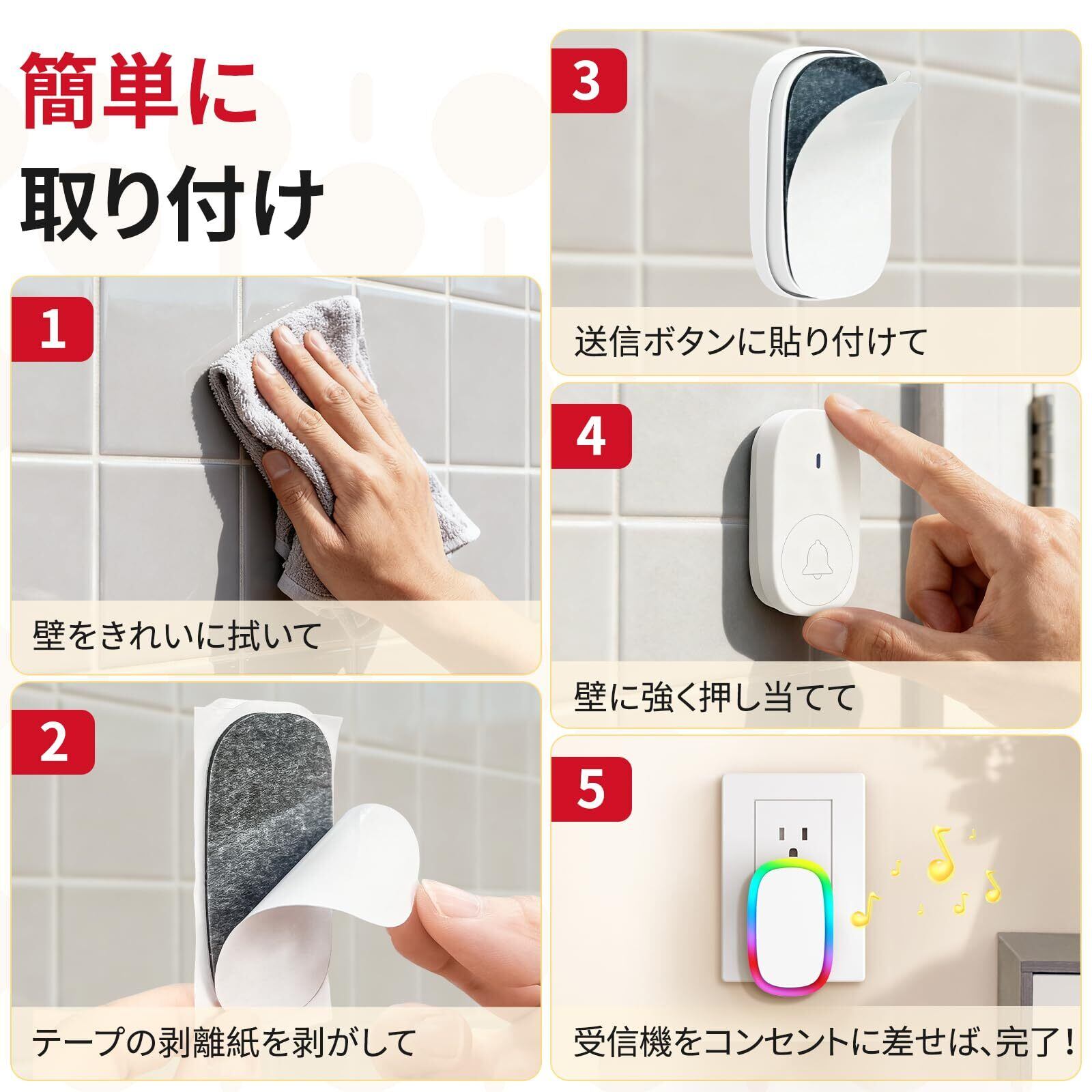 【ワンタッチ設置で工事一切不要】 強力両面テープで3秒で設置可能なドアチャイム。配線工事も電池交換も不要。発信機はドアに貼るだけ、受信機はコンセントに差すだけの簡単設置。高齢者宅や店舗の増設にも最適なドアベル 店舗用として、すぐにご利用いただけます。