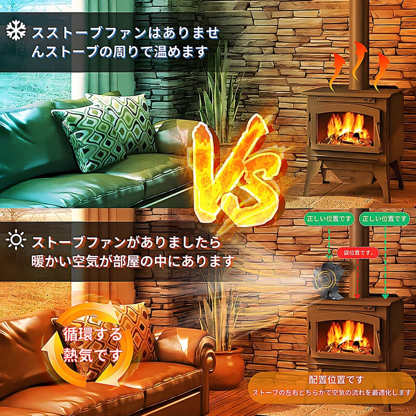 【2025最新改良型ストーブファン・省エネ・耐久性】この暖炉ファン、薪ストーブ、ガスストーブ、薪ストーブ、暖炉などに広く使用されています。ストーブの熱で発電する為、電源もいらず、エコなファン装置です。このようにして空気の循環が生まれ、暖気が部屋全体にまわり、暖房効率が最大38%向上します。10畳程度のキャンプ用テントでもあっという間に暖かくなり、足元まで温まります。改善された熱空気の循環はより大きな快適さをもたらすことができ、使用したストーブの木材は28%減少します。また、日本製のモーターは長寿命で安定しており、耐久性も向上しています。