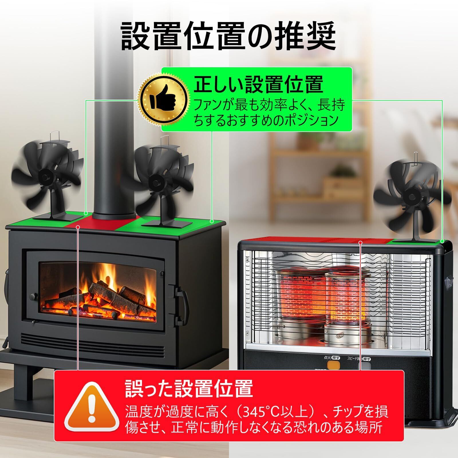 ご注意:エコファンの動作可能温度は50°C–345°Cです。石油ストーブや薪ストーブ使用時は上部中央温度が推奨範囲を超える可能性があるため、ファンは高温域を避けて設置してください。運転中は本体やブレードに触れず、やけどや危険防止のため児童やペットの接近にご注意ください