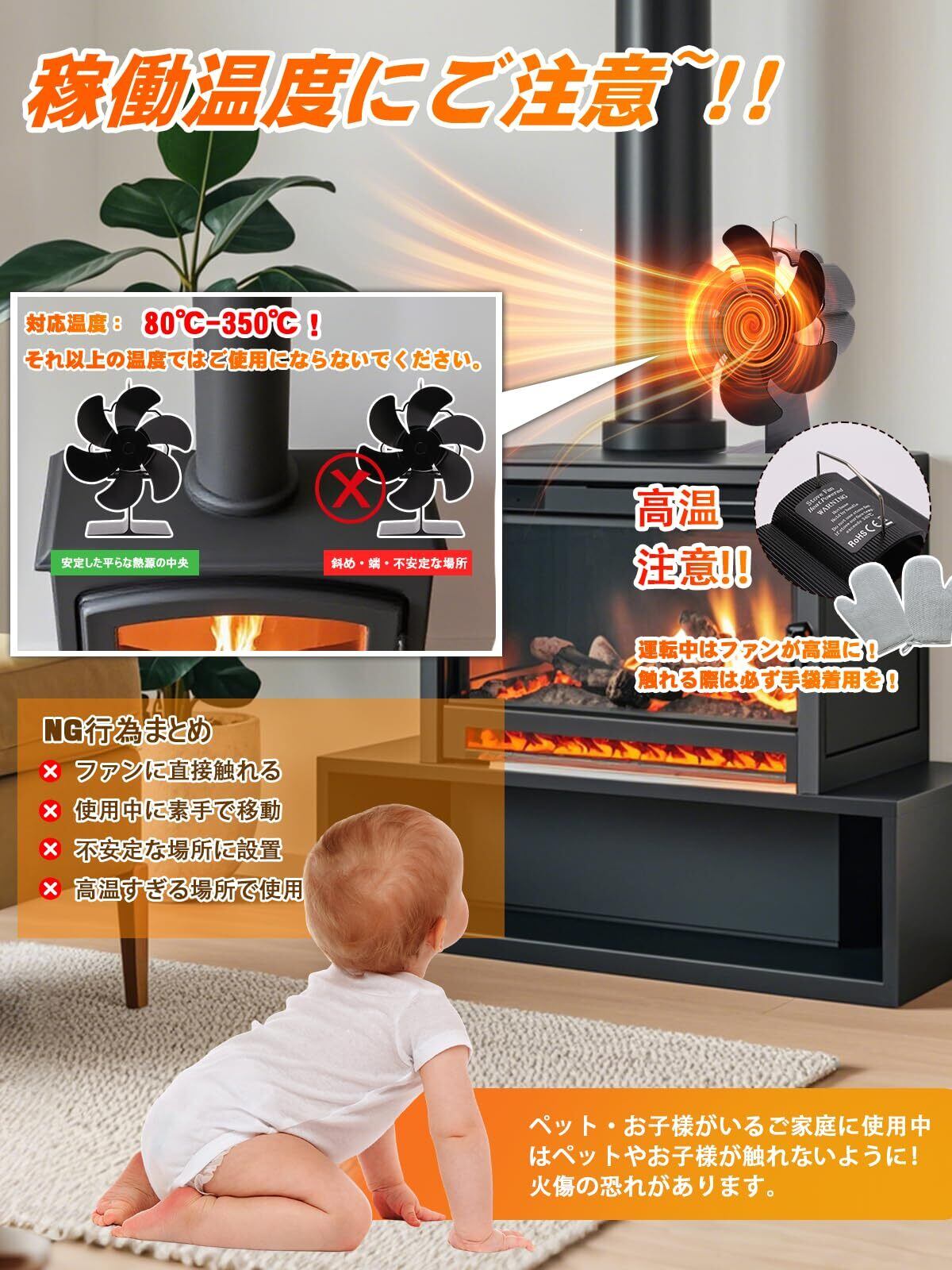 ストーブファン 石油ストーブファン 6枚羽根【熱駆動・電源不要】薪ストーブ用ファン エコファン 16cm大径ブレード 77cm²大接地面 ⾃動回転 日本製モーター搭載 静音 暖房効率アップ 磁気温度計付き 過熱保護