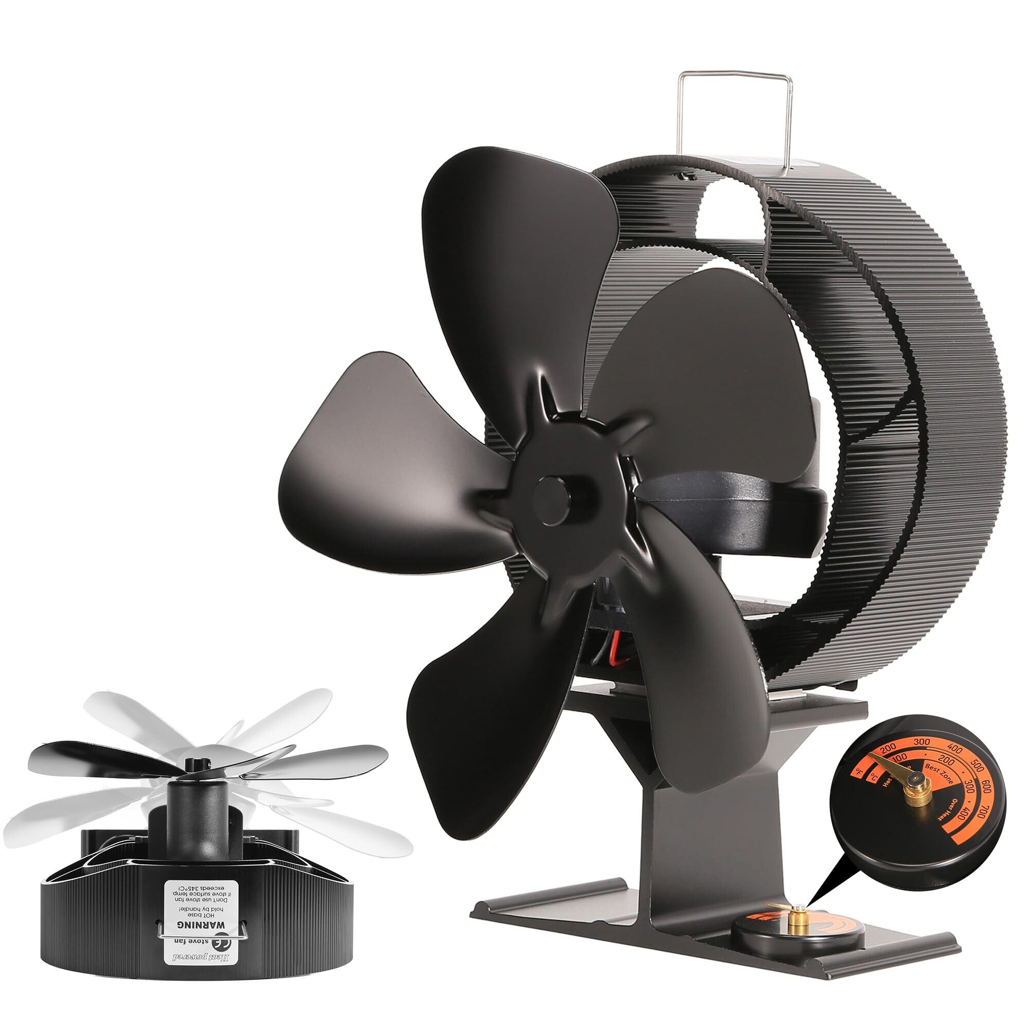【数量限定】ストーブファン 首振り 小型 静音 キャンプ用 5枚羽 石油ストーブ用ファン 薪ストーブ 廃油ストーブ 扇風機 電源不要 省エネ 温度計付き