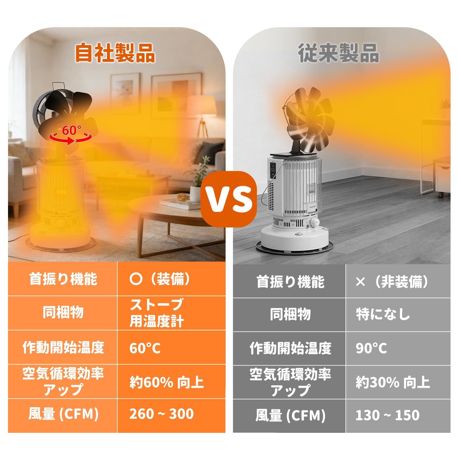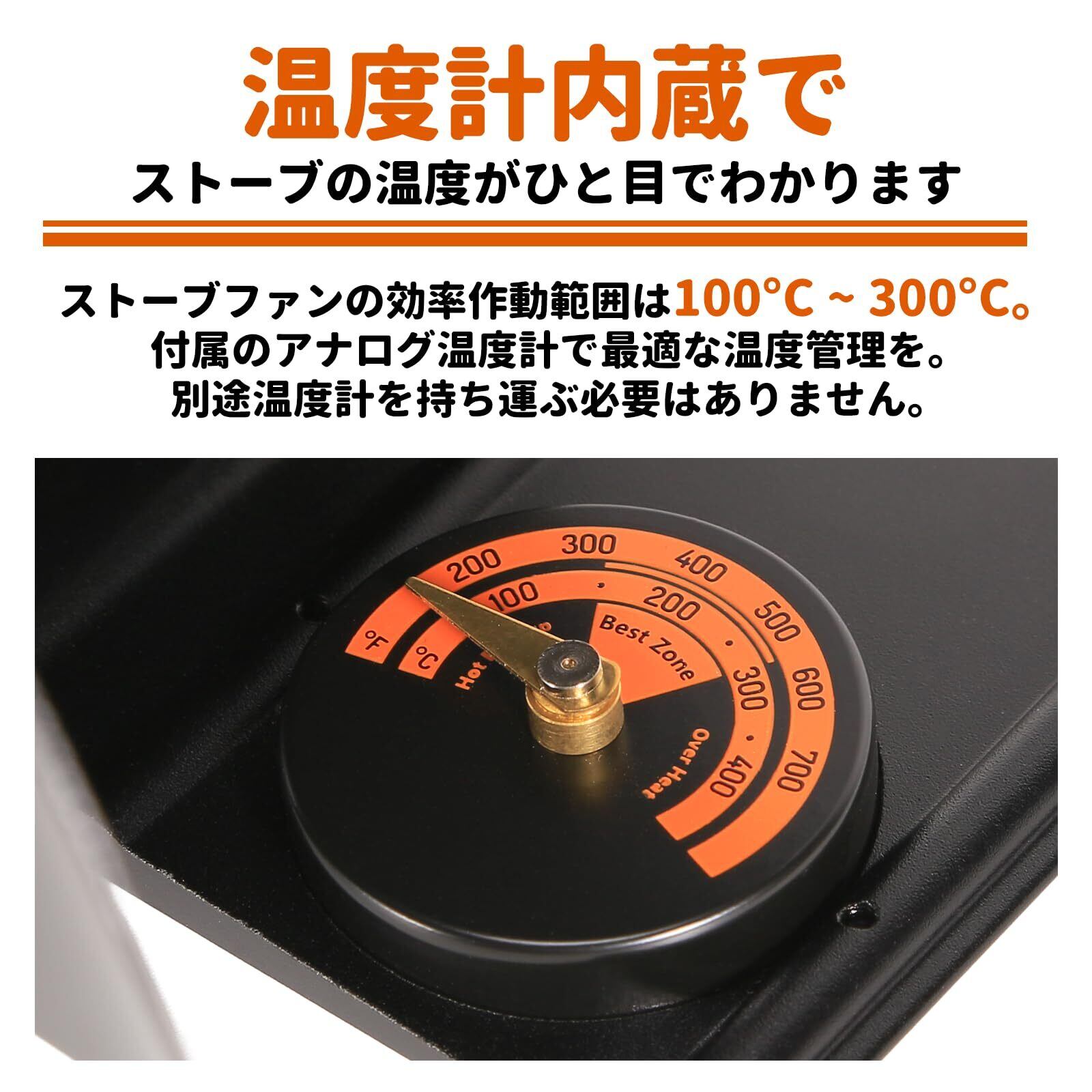 【強力な気流で温度ムラを解消】 300CFMの風量により、ストーブの熱い空気を素早く循環。60度のオシレーション(首振り)機能付きで、ストーブ温度が100℃に達すると自動的に作動し、部屋の隅々まで均一な暖かさを実現します。理想的な動作温度は80~250℃で、小屋やキャンプ、リビングに最適。
