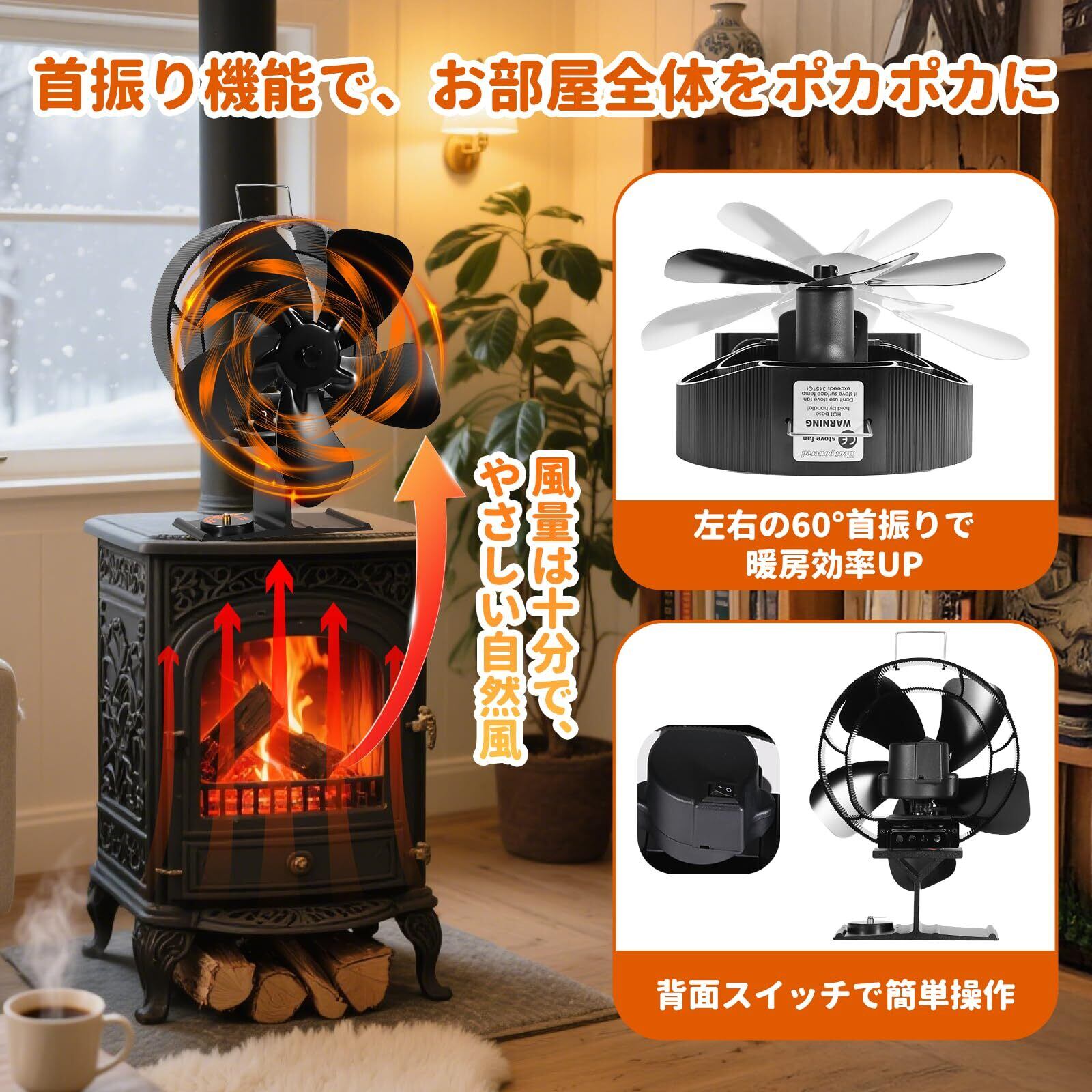本商品の最大の特徴は、ストーブの熱を利用して自動で羽根を回転する熱駆動式です。電源や電池が不要なため、環境にも優しく、手軽にご利用いただけます。暖房コストを気にせずに、効果的に暖かい空気を広げることができます。