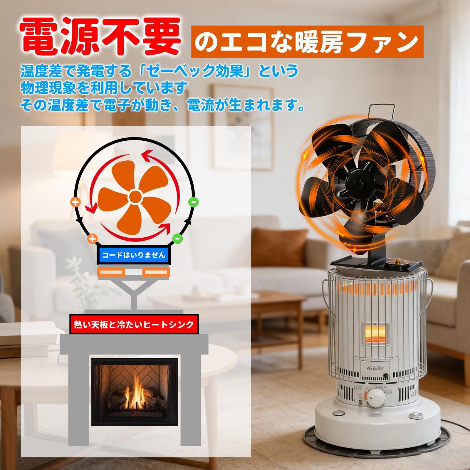 【電気不要で簡単設置】 電源コードや電池が一切不要。ストーブの熱だけで動くため、面倒な設定はなし。ストーブの上面が50℃以上になると自動始動し、冷却すると停止します。設置はストーブの平らな上に置くだけ。お手入れも乾いた布で拭く簡単さです。