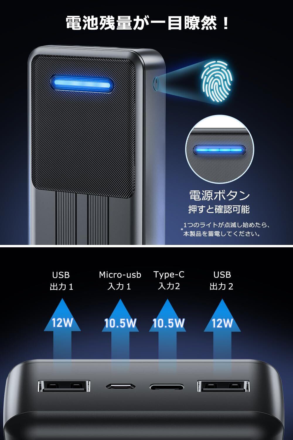 【高出力10.5W対応・Smart IC搭載】最大2.1A入力対応。USB Type-CとMicro-B入力ポートを装備し、効率的な急速充電が可能。低電流モード搭載で、Bluetoothイヤホンやスマートウォッチなどの小型機器も最適に充電できます。