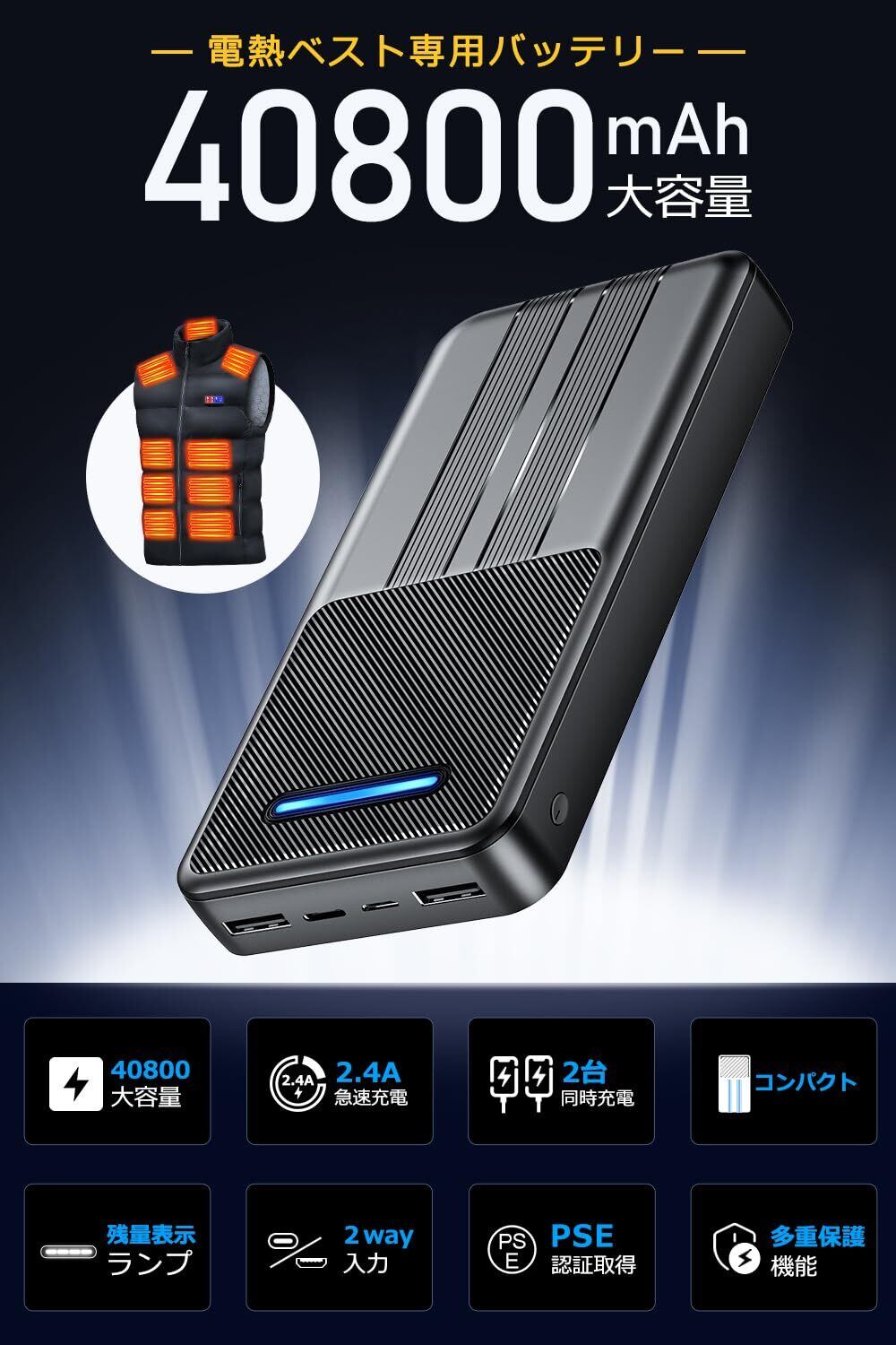 【特価セール】電熱ベスト バッテリー 【2026新登場・40800mAh大容量】モバイルバッテリー 急速充電 加熱ベスト 専用電池 バッテリー给電 長い使用時間 5V出力 2WAY入力ポート USB出力ポート PSE認証済 電熱ジャケット/電熱ウェア/防寒ベスト/電熱ズボン各種対応 (ブラック)