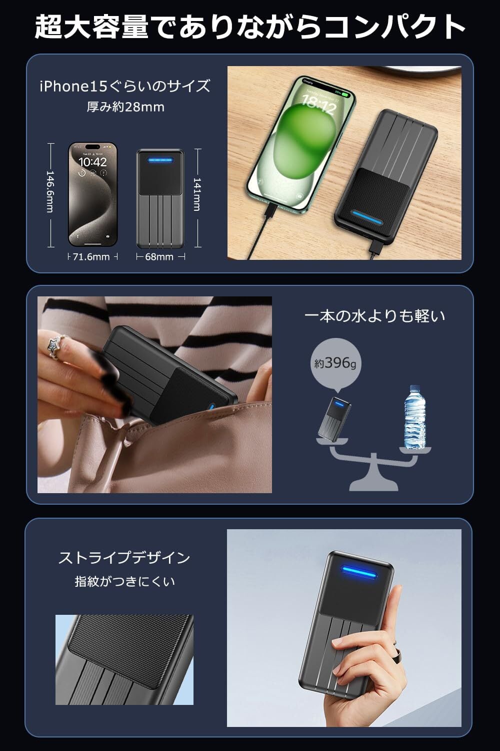 【軽量・コンパクト&機内持ち込み対応】わずか約396g、141×68×28mmのスリム設計。USB-A出力ポートを2口搭載し、2台同時充電も可能。航空機内持ち込み基準を満たし、国内外の旅行や出張にも便利です。 (※航空会社によって規定が異なる場合があります)