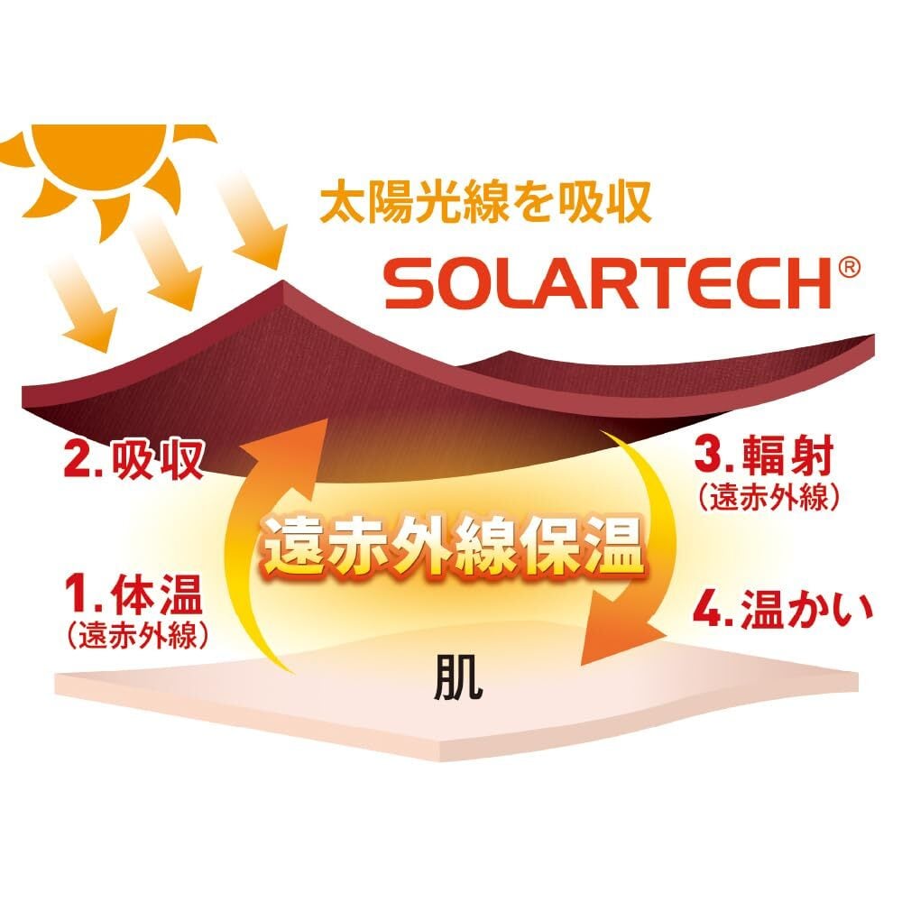 本製品は、SOLAR TECH®技術によって光を吸収し、体温を効率的に保持します。これにより、寒い日でも暖かく快適に過ごすことができます。特殊な裏ブロックフリースを使用しており、肌触りもよく、冷気の侵入を防ぎます。