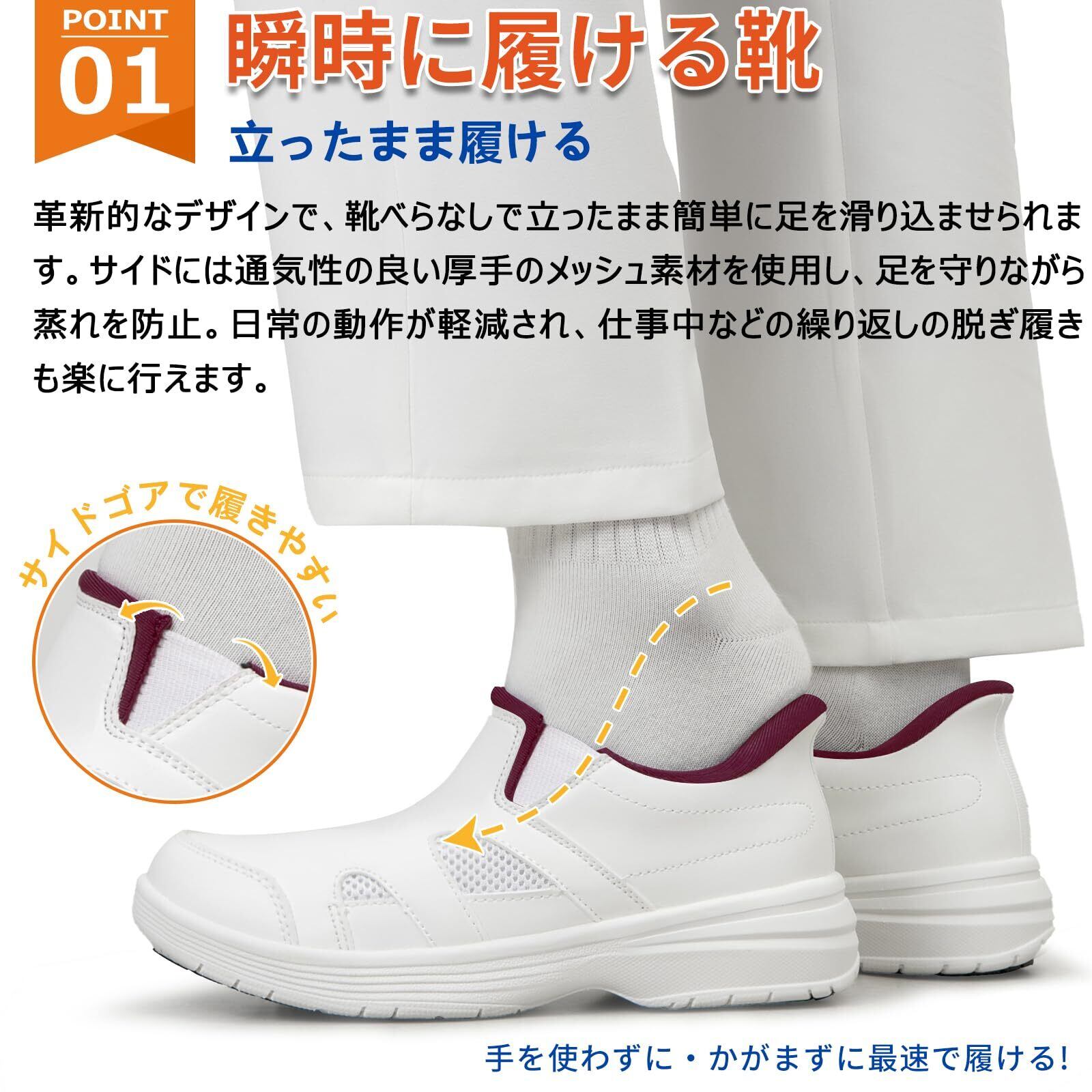 【立ったまま履ける】かかと部分の傾斜で、立ったまま足を滑り込ませるだけで簡単に着用できます。自動フィット構造とは、手を使わずに靴の脱ぎ履きを可能にする仕組みで、かかとのカップが足をしっかり支え、スッとスムーズに脱ぎ履きができます。・忙しい時の脱ぎ履きのストレスゼロ!・靴を触らないので手が清潔!・荷物を持ったまま脱ぎ履きOK!医療・介護現場で働く方の足元を支える便利な構造です。