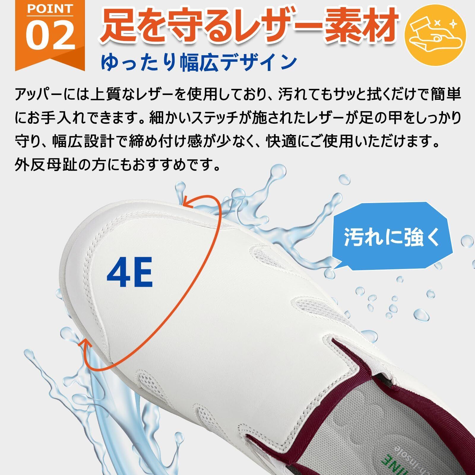 このスニーカーは、特別なデザインにより、両手を使わなくてもスムーズに履くことができます。さらに、4Eの幅広設計で、快適なフィット感を実現。長時間の立ち仕事や移動時も足をしっかりと支え、ストレスのない足元を提供します。