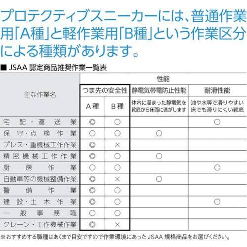 片足300g以下(26.0cm)の超軽量タイプ。プロテクティブスニーカー型式A種認定合格品。樹脂製のメッシュ使用で通気性抜群。布メッシュよりダイレクトに靴内の空気循環を促し、常に爽やかな靴内をキープします。超軽量ソール使用。幅広(4E)対応。