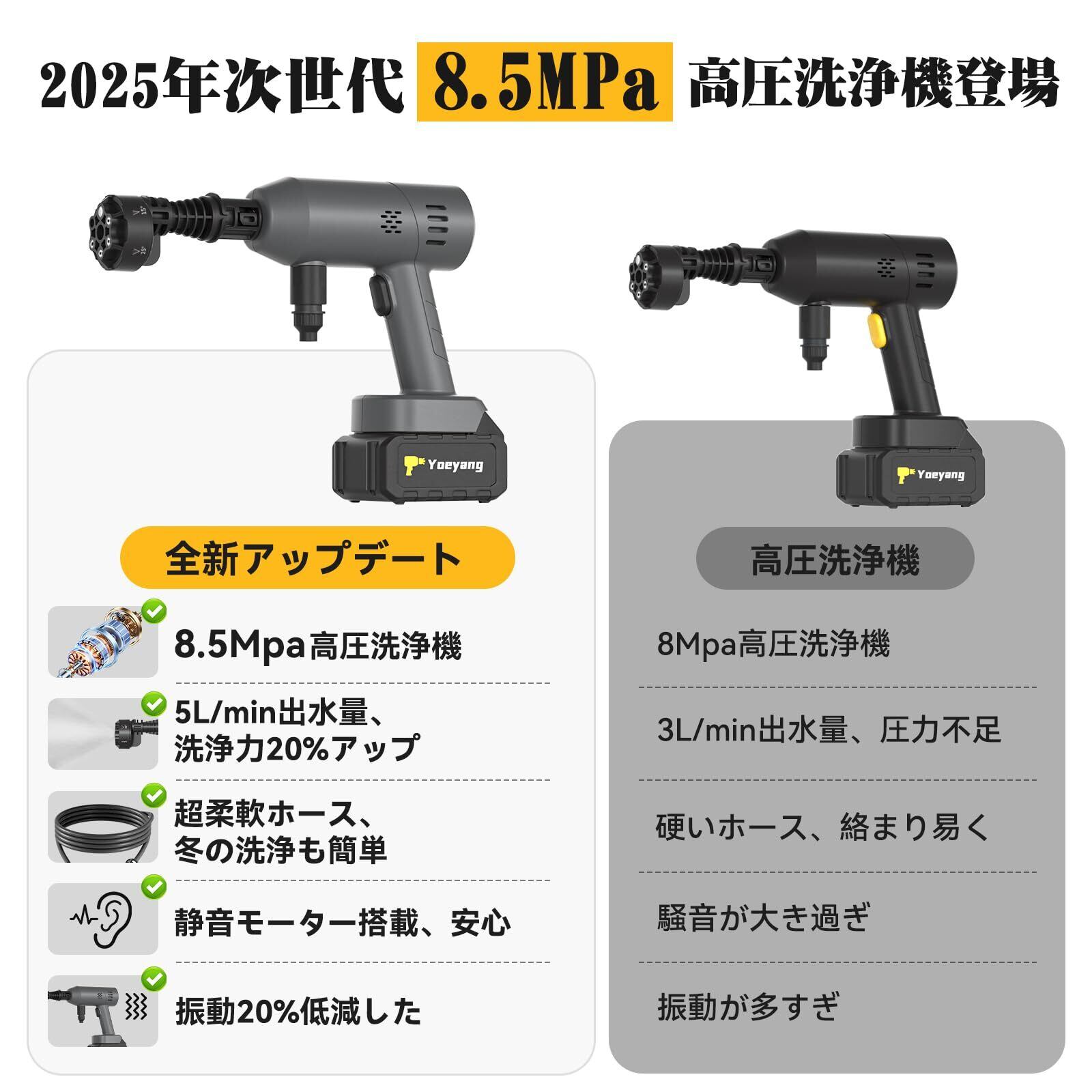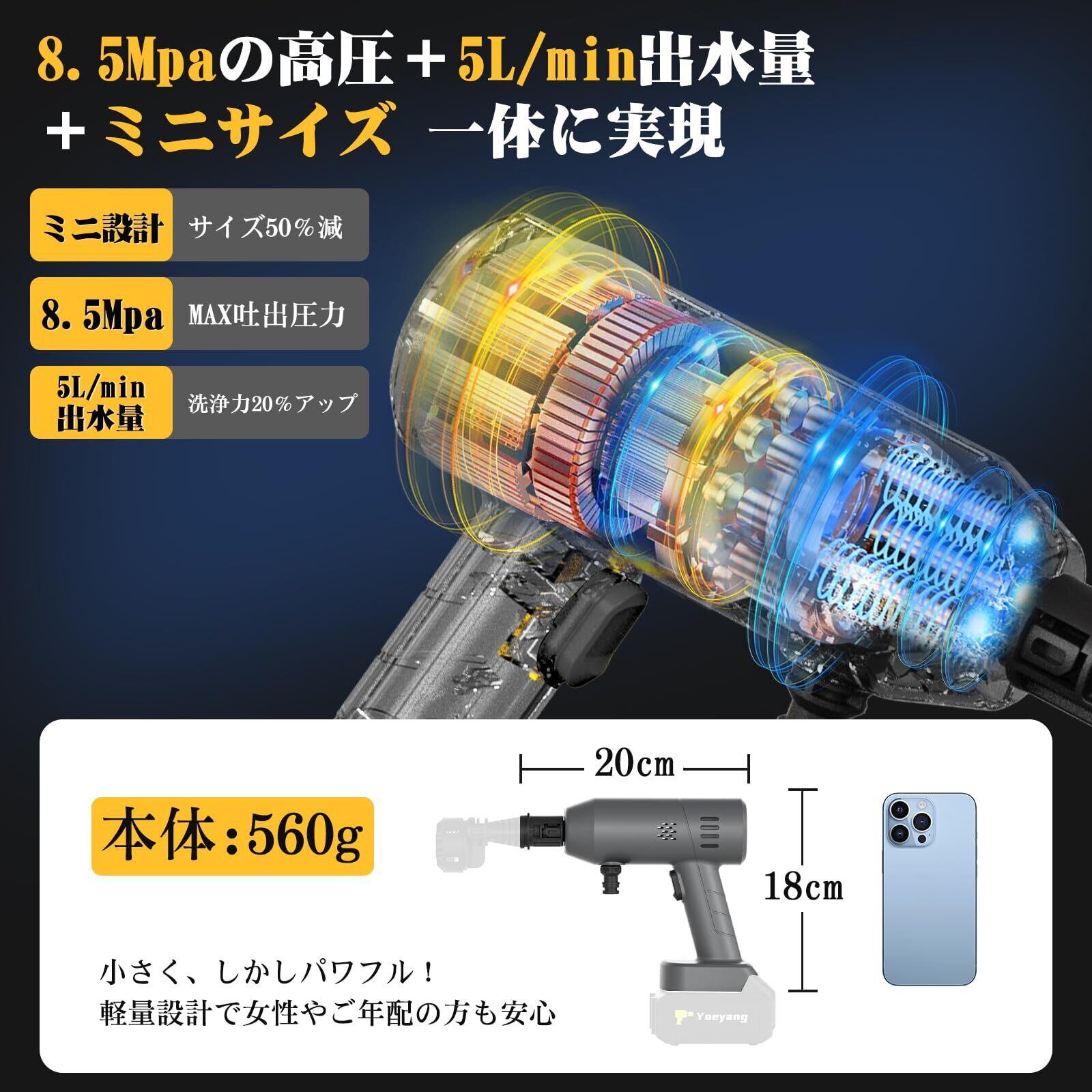 【Yoeyangサイシンモデル・8.5MPa高出力&業界最軽量560g】Yoeyangが革新を遂げてお届けするのは、この「パワー」と「軽さ」を両立した、かつてないミニ高圧洗浄機です。前スペックをご購入したお客様のご要望にお応えして、新たに強力な8.5MPaの高水圧と5L/minの出水量を実現した洗浄機登場。従来比洗浄力20%向上により、車のタイヤやボディにこびりついた泥、庭の柵、玄関周りの頑固な砂埃も、驚くほど簡単に吹き飛ばします。業界最小クラスの約20×7×18cm、わずか560gの超軽量ボディ。同等出力の他社モデルと比べて約50%も小型化したため、女性やご高齢の方でも疲れず、片手で楽々操作が可能です。高耐久ブラシレスモーター&高効率ポンプを組み合わせ、5L/minの出水量と高出力を長期にわたって安定供給、パワー不足を感じさせません。低騒音設計により、住宅街でも周囲を気にせず、思い立った時にすぐお使いいただけます。専用収納ボックス付きで、本体と付属品のまとめ収納が可能。玄関クローゼットや下駄箱、車のトランクなど、ちょっとした隙間にもすっきり収まり、アウトドアや洗車のお供にいつでもすぐお出かけできます。今回、色味も更新し、グレーカラーを追加いたしました。