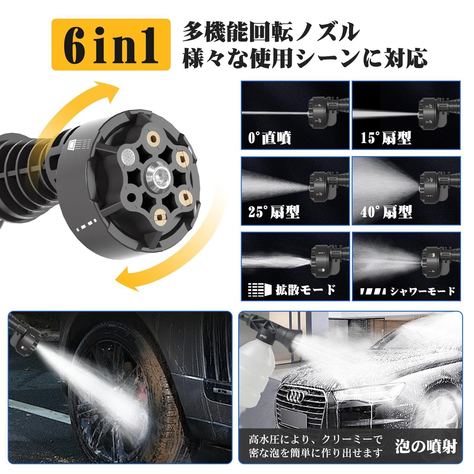 【6in1多機能ノズル & 強化泡ノズル】Yoeyangコードレス高圧洗浄機は、あなたの思い通りに水流をコントロール。革命的な「6in1多機能ノズル」を採用し、回すだけで、頑固な汚れへの集中洗浄(0°)から、広い面積の効率清掃(15°・25°・40°)、そして優しい拡散モード、シャワーモードまで、6つの噴射モードを瞬時に切り替え。あらゆる素材と汚れにぴったりの水流を、簡単に選べます。さらに、こだわりの「泡ノズル」で、洗車がもっと楽しく、もっと綺麗に。アップグレードされた耐久設計の泡ノズルは、専用洗剤を入れるだけで、豊かで密なクリーミーな泡を噴射。車やバイクにまるで泡のシートをかけるように、優しく、そして徹底的に汚れを浮かせ落とします。家中も、アウトドアも、仕事も。これ1台で、あなたの生活のあらゆるシーンを強力サポートします。※ご注意:本品は自吸式設計のため、給水システムを直接接続した場合、高圧洗浄機本体のスイッチで水流の制御はできません。あらかじめご了承ください。