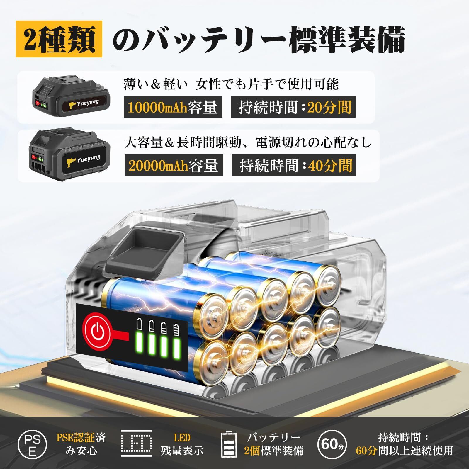 【充実の30000mAhバッテリー搭載 & 残量表示機能】あなたの洗浄スタイルに合わせて選べます、Yoeyangのコードレスミニ高圧洗浄機に「2種類のバッテリー標準装備」という画期的な仕様を装備しました。10000mAhと20000mAhの2つのPSE認証リチウムイオンバッテリーを組み合わせることで、合計30000mAhの大容量を実現、最大約60分の連続使用を可能にします。日常的な軽いお手入れには「10000mAh」、本体重量約900gの軽さを活かした、手軽で快適な洗浄を。女性の方でも負担なく、さっと手に取ってすぐにお使いいただけます。広い場所やじっくり作業するときは「20000mAh」に交換して、大容量で長時間の連続稼働を実現、作業の中断を減らし、効率よく最後まで洗い上げられます。LED残量表示搭載しており、電池切れの不安を解消。充電タイミングが一目でわかるので、計画的な使用が可能です。マキタ18Vバッテリー互換可能で、お持ちの方は別途バッテリー購入が不要。コストを抑えて、より長く洗浄をお楽しみいただけます。充実の安全機能もあり、過充電・過放電・過電流・短絡からの多重保護により、安全性とバッテリーの長寿命化を両立しました。