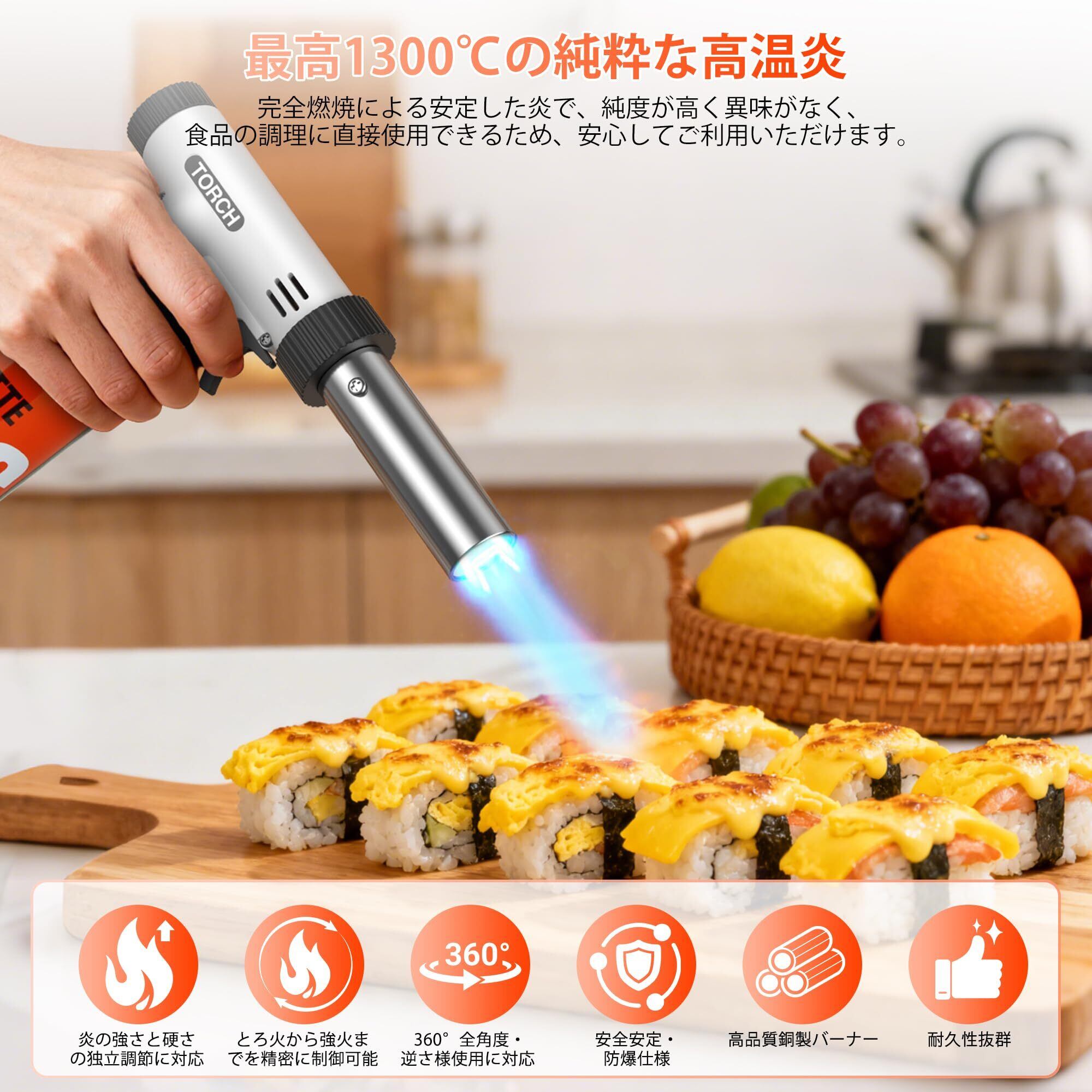 360°の自由な角度で使用可能なこのガスバーナーは、煮る・焼く・溶接と、さまざまな料理ニーズに対応します。逆さにしても使用できるため、あらゆる形状の食材や容器に対応可能。料理の幅が広がります!