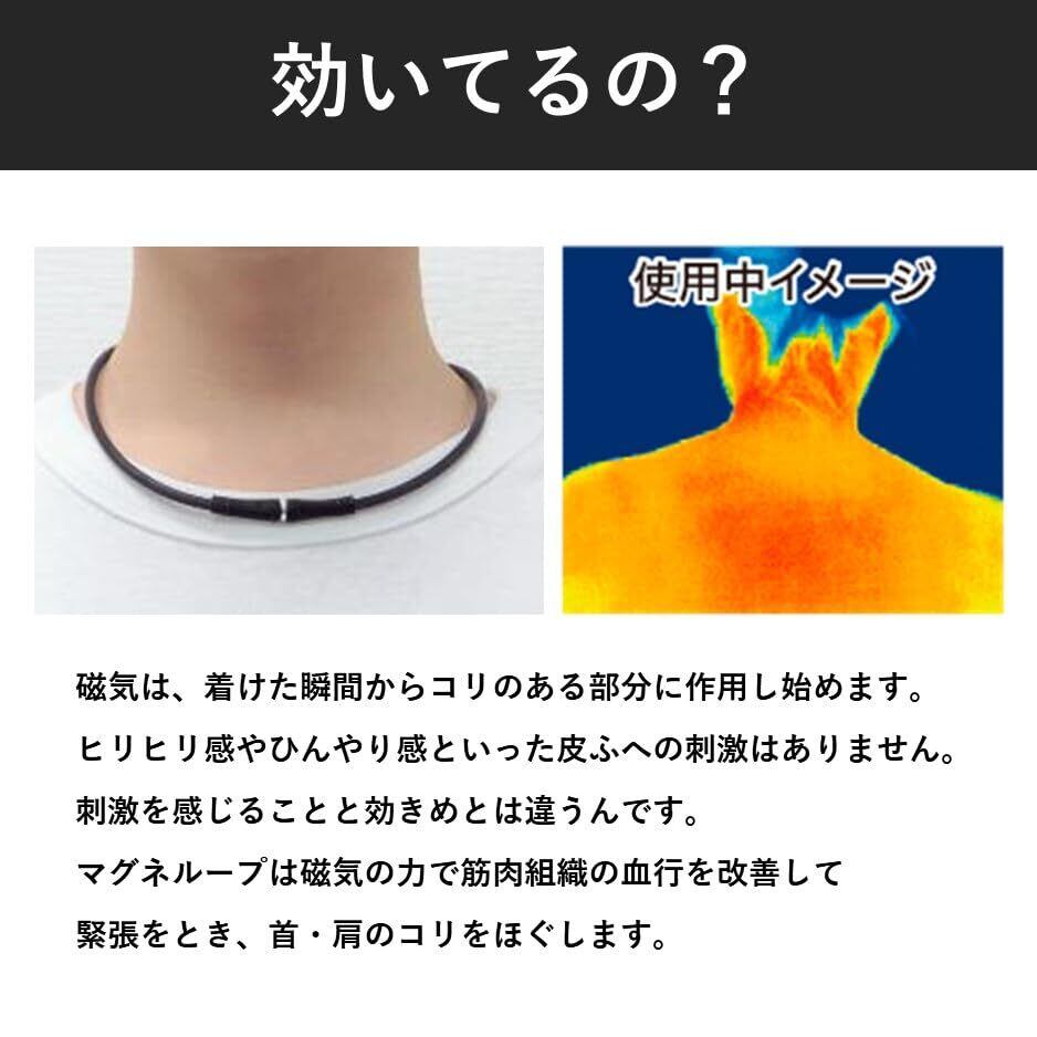 【商品特長】 国内最大磁力200ミリテスラ最強磁力のループがガンコなコリに効く! ●磁力のループが首・肩の血行を改善し、コリに効く。 ●キラッと輝くパーツ付き。 ●最大磁束密度200ミリテスラの磁力を6粒内蔵。 ●ループ全体から最大磁束密度55ミリテスラの磁力を放射。 ●首から肩に広く磁気が浸透。 ●無理な力がかかるとはずれる安心設計。 ●着脱カンタン。 ●水洗い可能。 ●ブラック50㎝ 【使用上の注意】 (1)心臓ペースメーカ等植込型医用電子機器、または脳脊髄液短絡術用圧可変式シャントなどの医用電気機器を使用している方は、誤作動を招くおそれがありますので使用しないでください。 (2)医師の治療を受けている方や下記の方は必ず専門家と相談の上ご使用ください。 ・悪性腫瘍のある方 ・心臓に障害のある方 ・妊娠初期の不安定期または出産直後の方 ・糖尿病などによる高度な末梢循環障害による知覚障害のある方 (3)時計、磁気カード、フロッピーディスクなど磁気の影響を受けるものには近づけないでください。(データを破壊する原因になります。) (4)機器は改造しないでください。