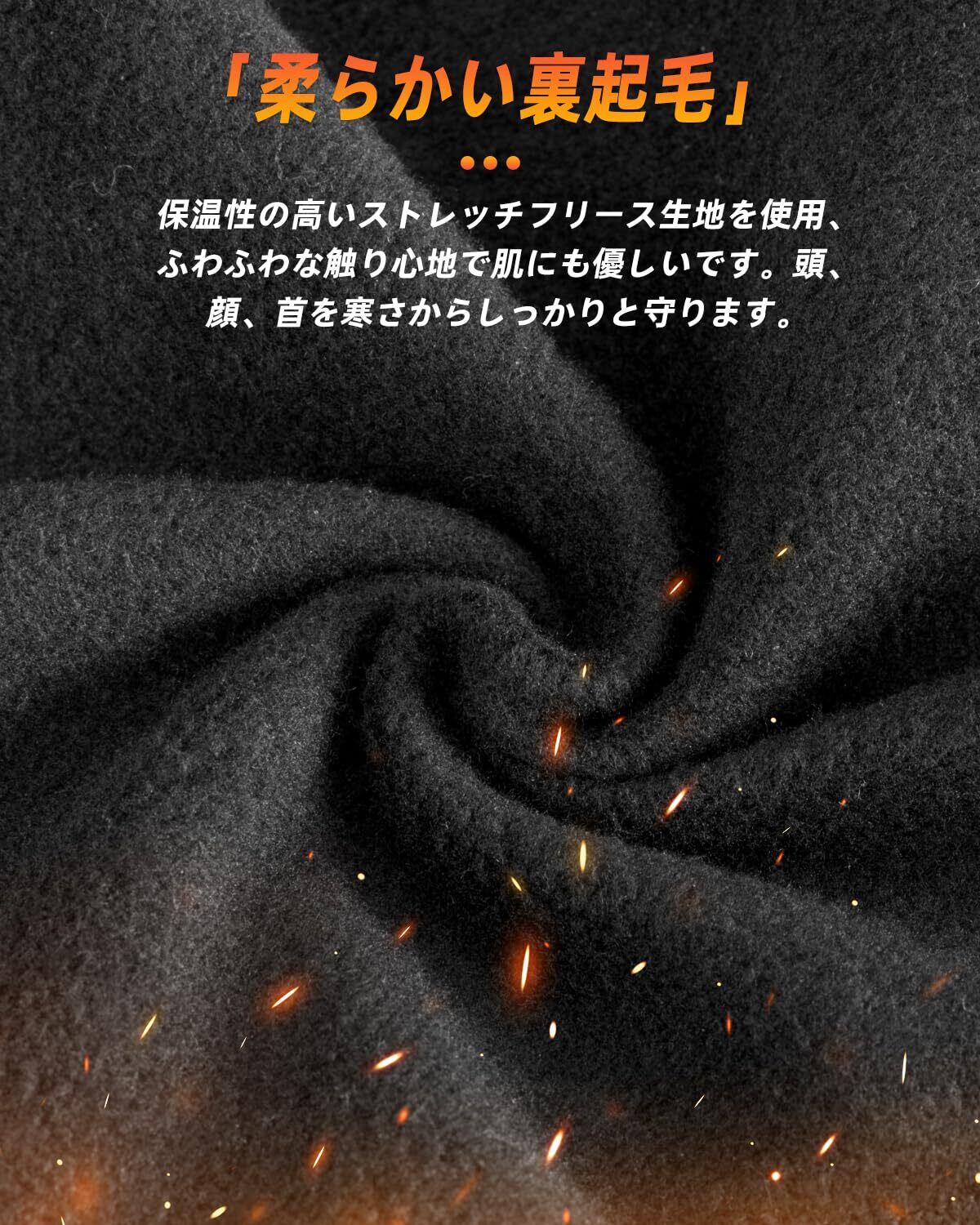 【360度防寒&裏起毛】360度すっぽり覆うデザイン+肩当て加長にする設計だから、バラクラバは首元に空いた隙間からの風や冷気を効率よく防ぎ、頭、顔、耳、首を風や寒さからしっかりとガードします。裏地には保温性の高いストレッチフリース生地を使用、ふわふわな触り心地で肌にも優しいです。ふんわりと頭と首周りを包み込む軽い被り心地で、暖かくて気持ち良く着けます。