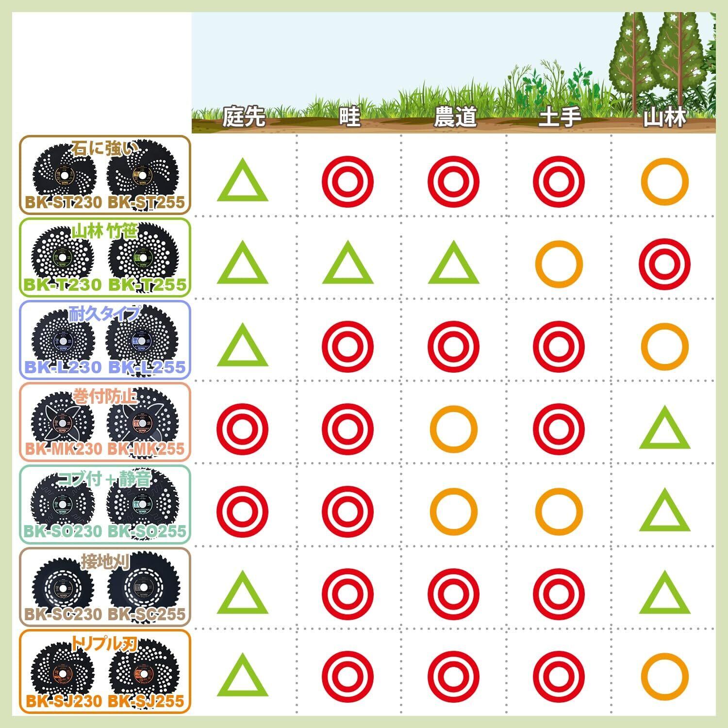 255mmの外径は、広い作業面を一度でカバーし、雑草除去や荒地の整備を効率的に行えます。家庭の小さな庭から広大な農地まで、様々なシーンで活躍します。