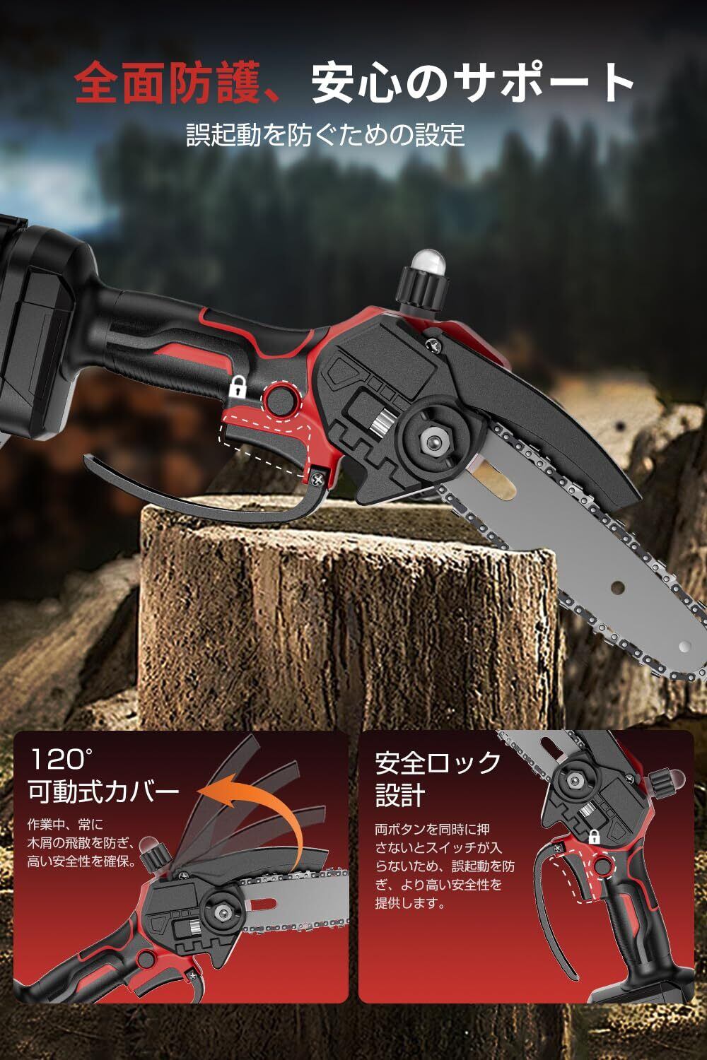 【軽量化と安全性を両立】 本小型チェーンソーは軽量と安全保護を一体化し、超軽量技術設計を採用し、本体の重量はわずか854gで、手首や腕の負担を大幅に軽減し、長時間の作業でもリラックスして快適に保つことができます。 小型でコンパクトな機体は、高所や狭所など様々な作業ニーズに幅広く対応し、高精度かつ効率的な作業を実現します。 一方、ユーザーの安全を確保するために、二重ボタンの安全ロックシステムを装備し、効果的に誤作動を防止します。 また、本電動チェーンソーには木屑の飛散を防ぐ可動式プレートカバーが装備され、目と手を保護するゴーグルと保護手袋も付属しているため、効率的なソーイングを楽しめるだけでなく、安心感も得られます。