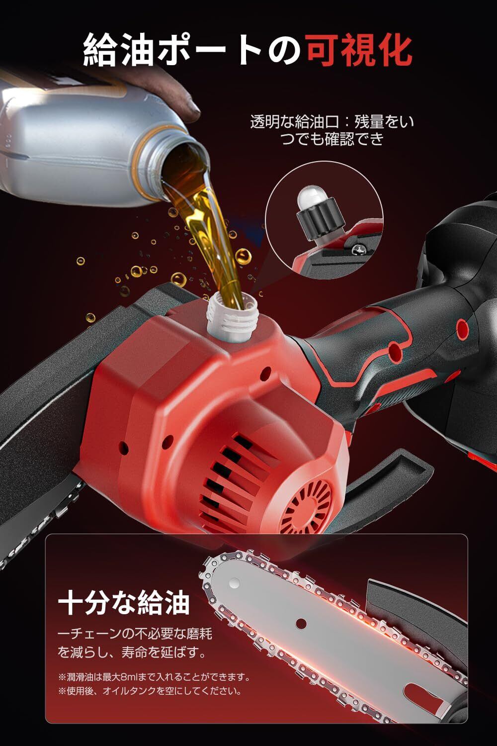 【可視化の給油ポート】 この電動チェーンソーは、最新の自動給油システムを採用し、チェンソーを分解する必要はありません。ソーチェーンに注油することができます。十分な潤滑は、チェンソーの寿命を延ばす、ソーチェーンの不必要な摩耗を減らすことができます。 透明なオイルキャップ、視覚的に潤滑油の使用進捗状況を確認することができ、潤滑油を適時追加することで作業効率を向上させることができます。ご注意:潤滑油は最大8mlまで入れることができます。使用後、オイルタンクを空にしてください。製品には潤滑油は付属しておりませんので、お手数ですが別途お買い求めください。