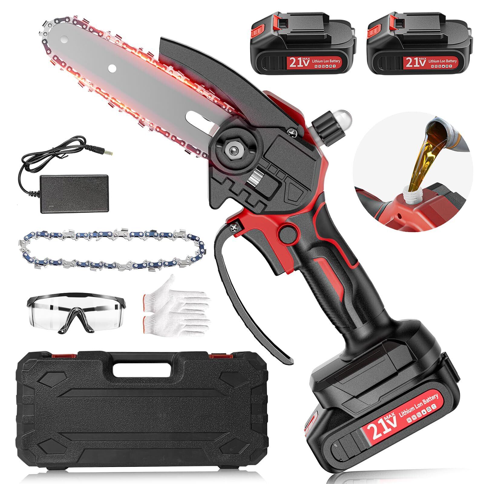 【技術改良 21V】電動チェーンソー 充電式 給油システム ツール不要 ミニ 片手 軽量 強力 小型チェーン ソー ハンディチェーンソー 21V大容量バッテリー 木工作業/薪作り/樹木の伐採/庭木の剪定/竹の伐採 収納箱付き 日本語取扱説明書付き (6インチ)