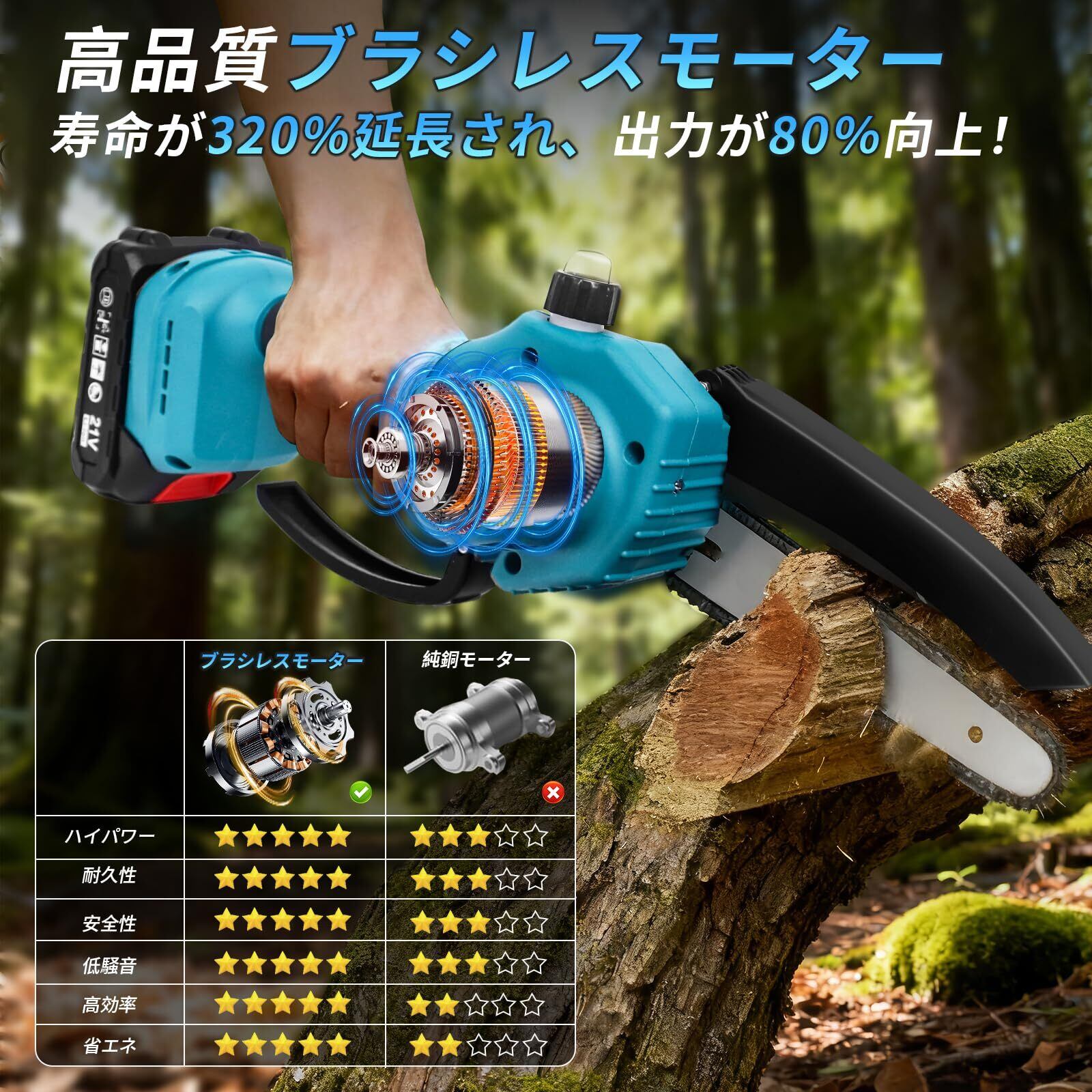 【 1本2役・高枝切りチェーンソー&ハンディチェーンソー・高品質ブラシレスモーター 】 改良版で、伸縮式延長ポールと接続可能で、高い所の枝も楽に切断できます。ハンディチェーンソーと高枝切り電動チェーンソーを自由に切り替えることができます。ポールを外して、手持ちのチェーンソーとして使用することもでき、さまざまな作業に対応できます。さらに、充電式チェーンソーはブラシレスモーターを採用し、ブラシの交換が不要で、強力で効率的な切断を実現します。ブラシレスモーターはブラシモーターに比べて寿命300%、出力電力が80%増加し、エネルギー消費量が60%削減されます。ブラシモーターより速く、より安定して動作しますが、摩耗が少なく、エネルギー消費が低くなります。スムーズで低ノイズ、効率的な切断で、安全です。