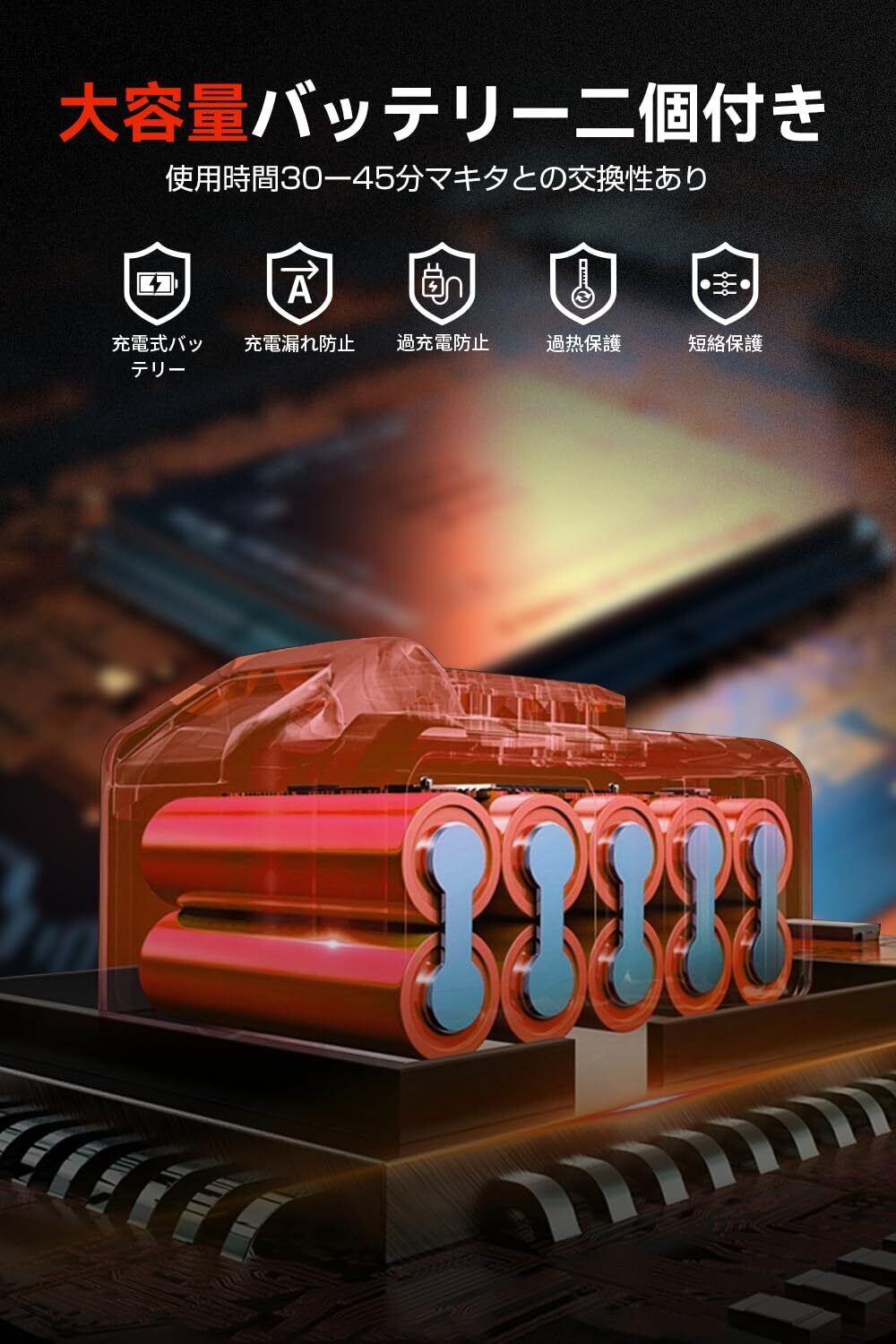 本商品は21Vの大容量リチウムバッテリーを2つ搭載しており、一度の充電で長時間の作業が可能です。電量表示機能により、残量が一目でわかるため、安心して使用できます!