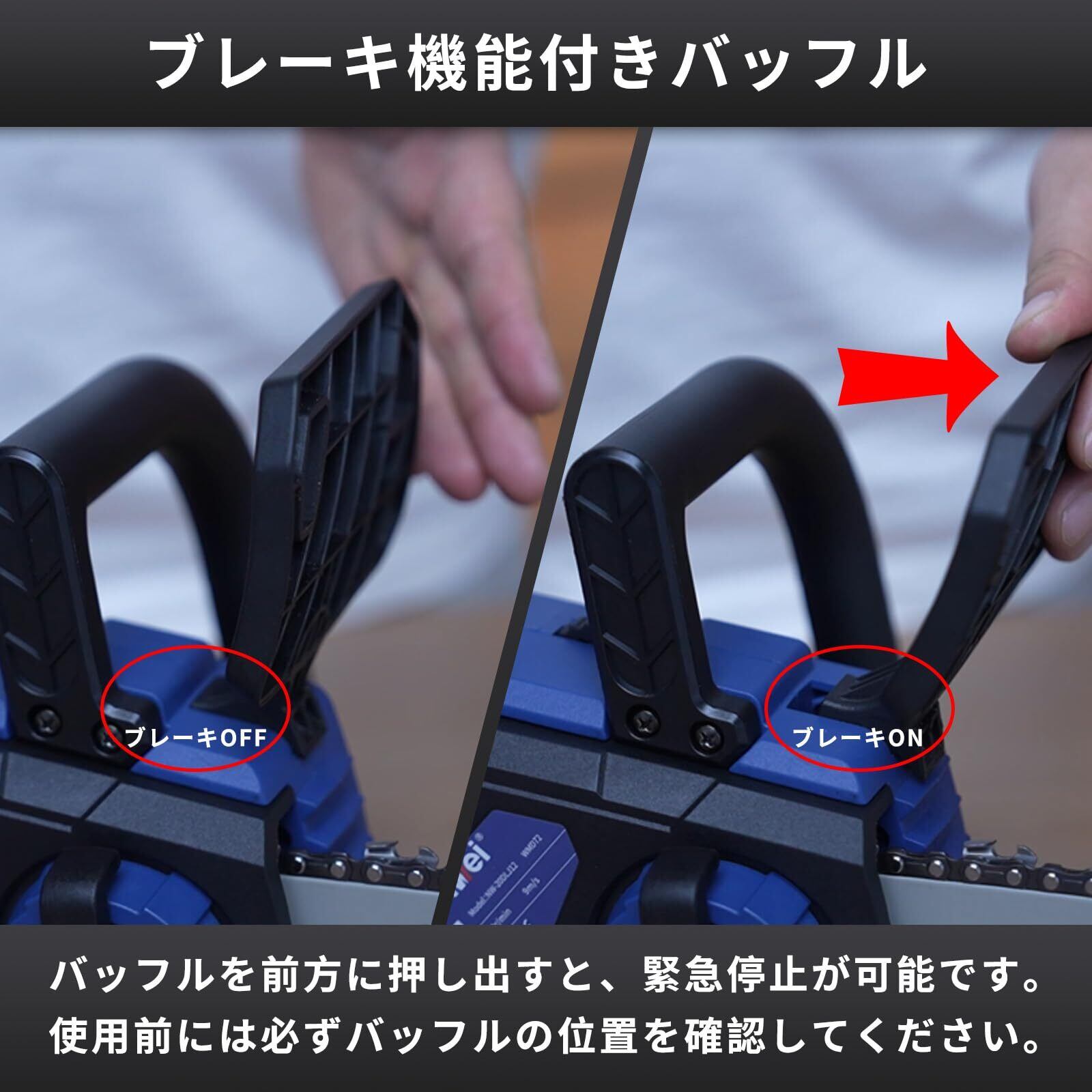 【ブレーキ機能付きバッフル】バッフルを前方に押すと、ブレーキが作動してチェーンソーが停止します。ロックボタンとスイッチを同時に押さないと起動しませんので、誤操作を防ぐことができます。また、人間工学に基づく設計のゴム製ハンドルは、滑り止めと振動軽減ができ、より快適な使用感をもたらします。