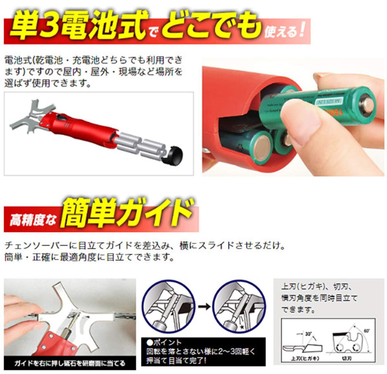 ●チェーンソー刃にガイドで研磨角度を固定するので上刃目立角度30度、上刃切削角度60度を正確に研磨。