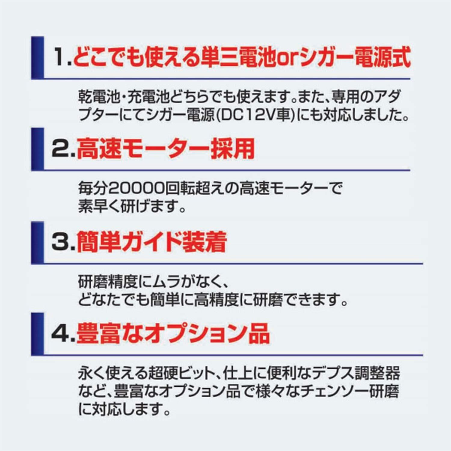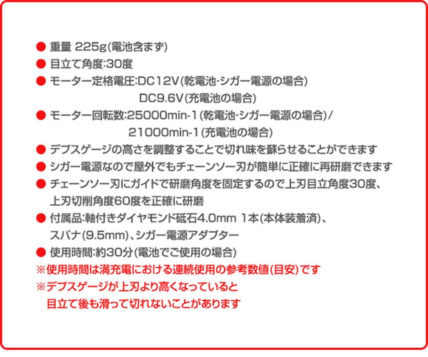 ●シガー電源なので屋外でもチェーンソー刃が簡単に正確に再研磨できる。
