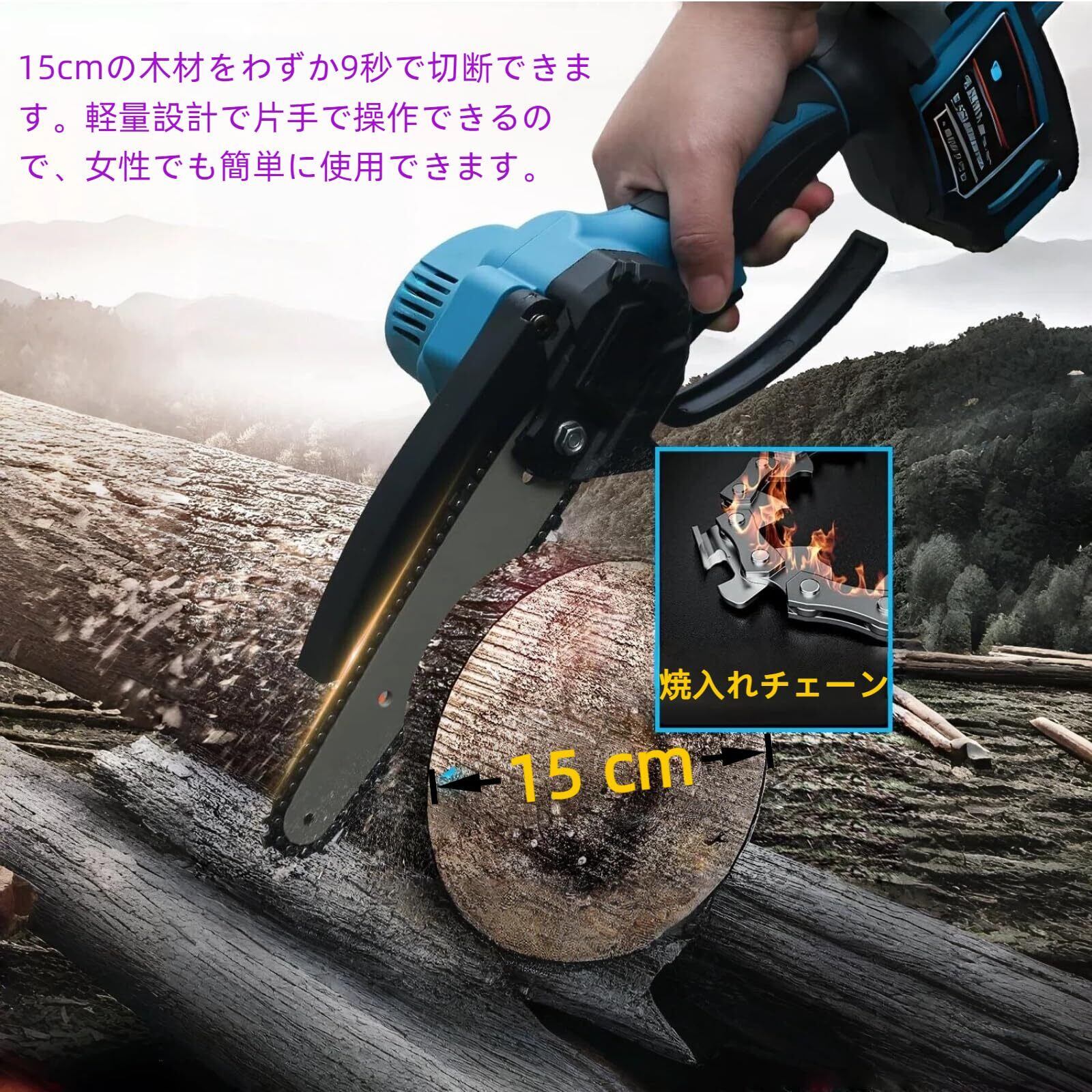 【在庫処分】6インチ コードレス電動チェーンソー、軽量で持ち運びに便利、片手操作、パワフルモーター、オール銅製モーター、工具不要のチェーン調整、ロッド接続、21Vバッテリー対応(本体のみ)