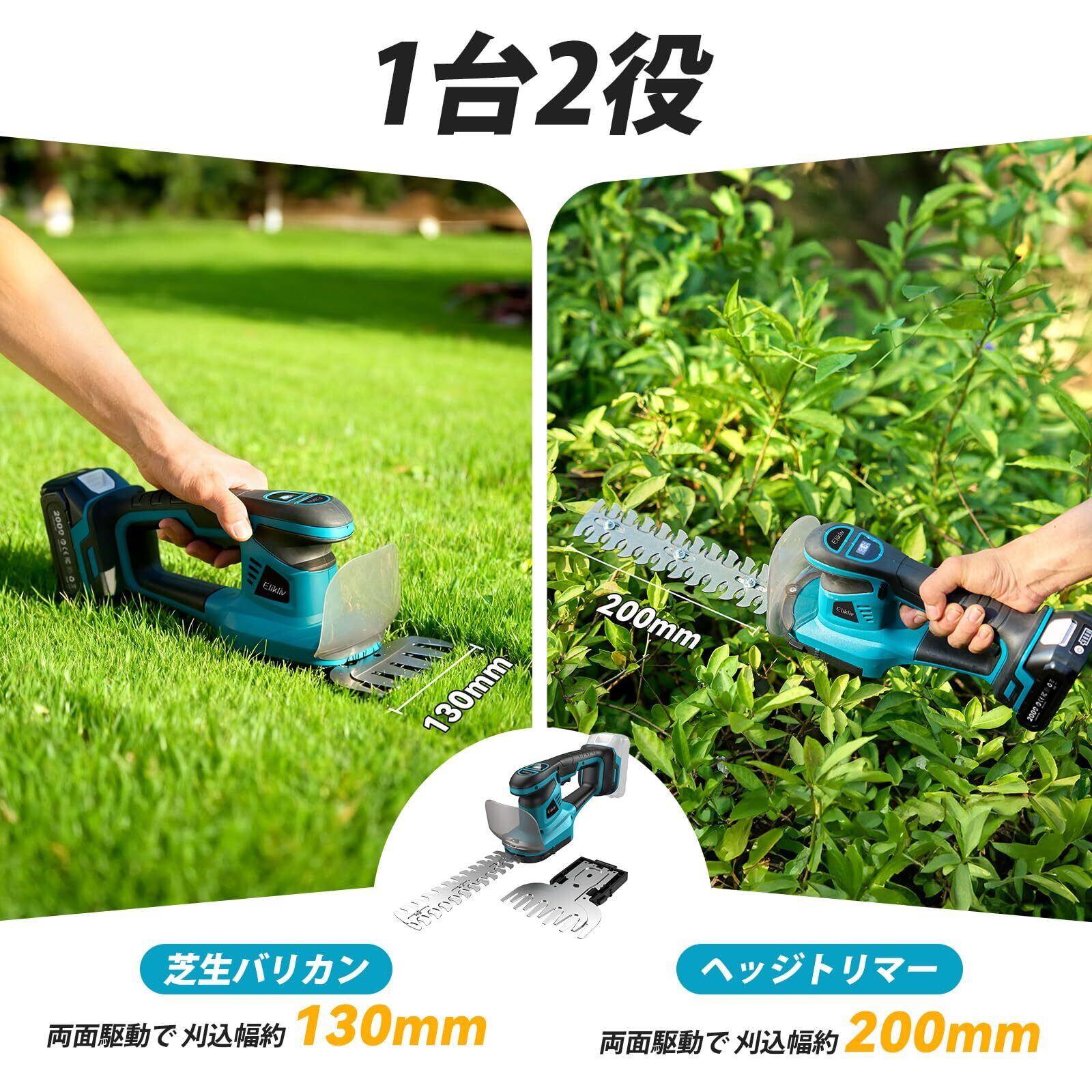 【特価セール】Elikliv 芝生バリカン ヘッジトリマー 充電式 1台2役 ガーデンバリカン 生垣バリカン 芝刈り機 コードレス 二重安全ロック グラスレシーバーと補助輪搭載 ブレード2枚付 バリカン刈幅130mm トリマー刈幅200mm 庭木剪定 植木 園芸 枝切り 垣根 大容量バッテリー2個付き剪定トリマー