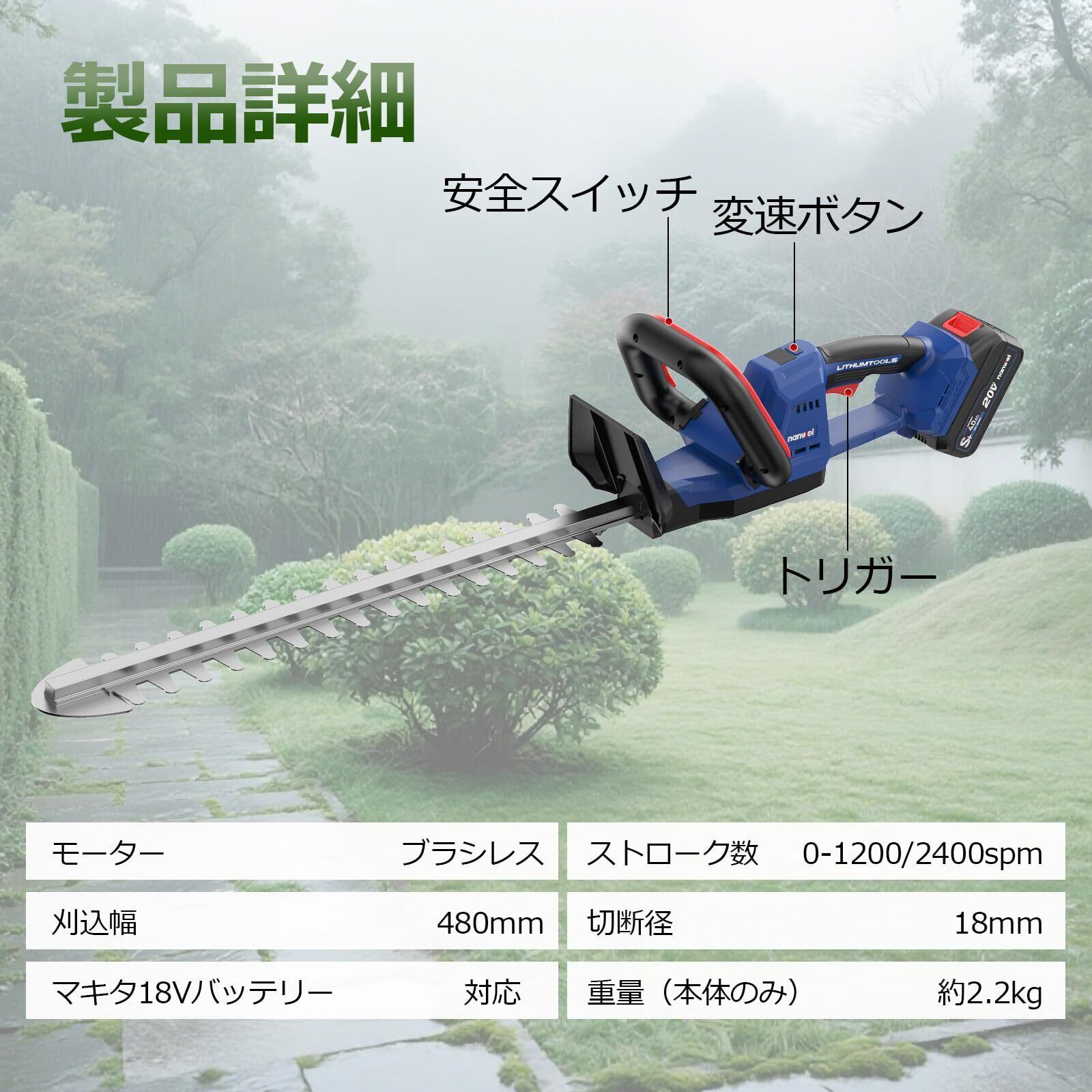 【数量限定】NANWEI ヘッジトリマー 充電式 電動ヘッジトリマー マキタ18Vバッテリー対応可能 有効刈り込み幅480mm 切断径18mm 両刃駆動 ブラシレスモーター 高速往復刈り コードレス電動トリマー ガーデントリマー 生け垣トリマー 剪定バリカン 植木バリカン 草刈りバリカン 本体のみ【充電器とバッテリー別売り】