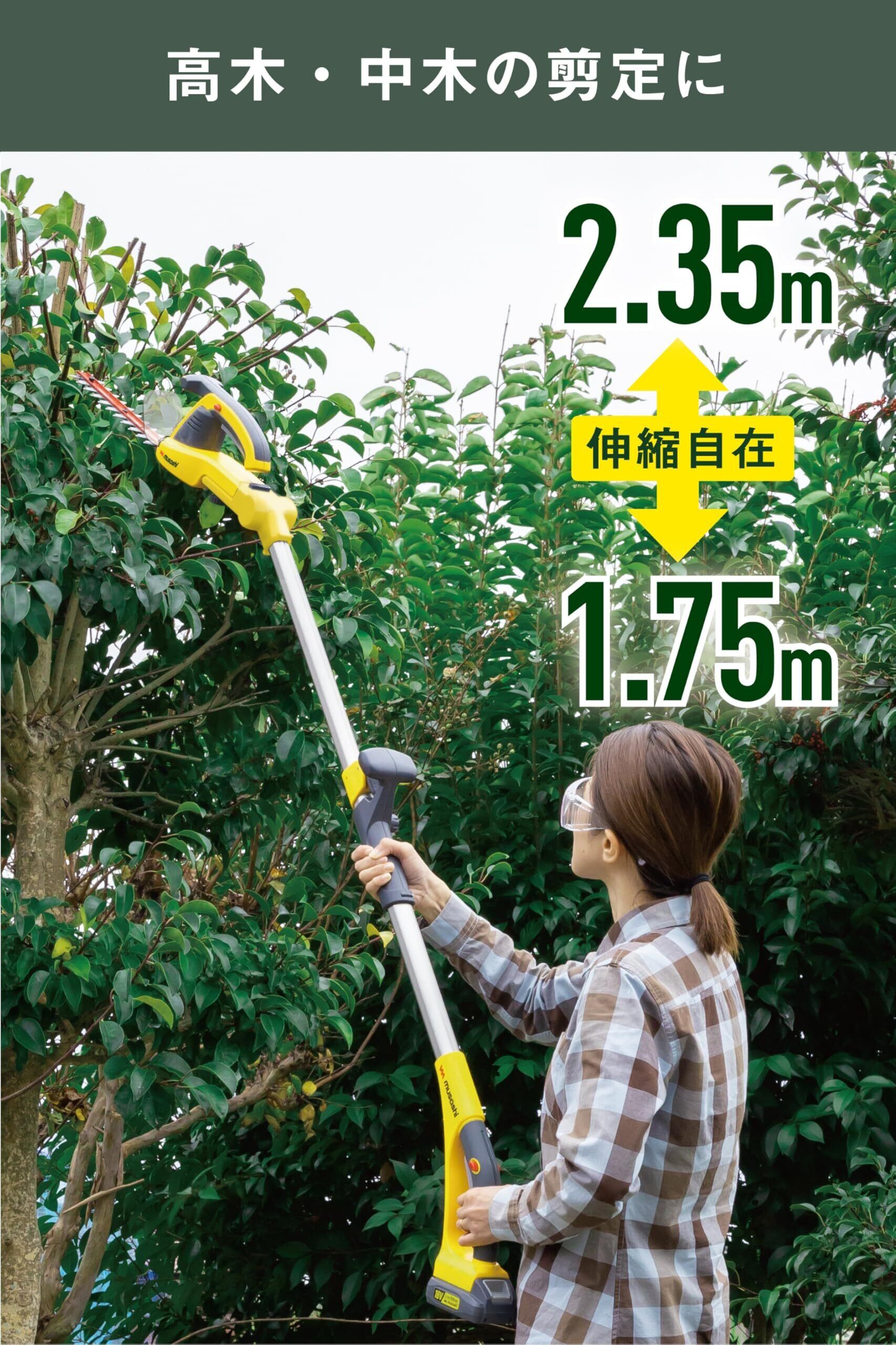 伸縮延長ポールは付け外しでき、手元・中木・下草の剪定・お手入れを1台で解決します。