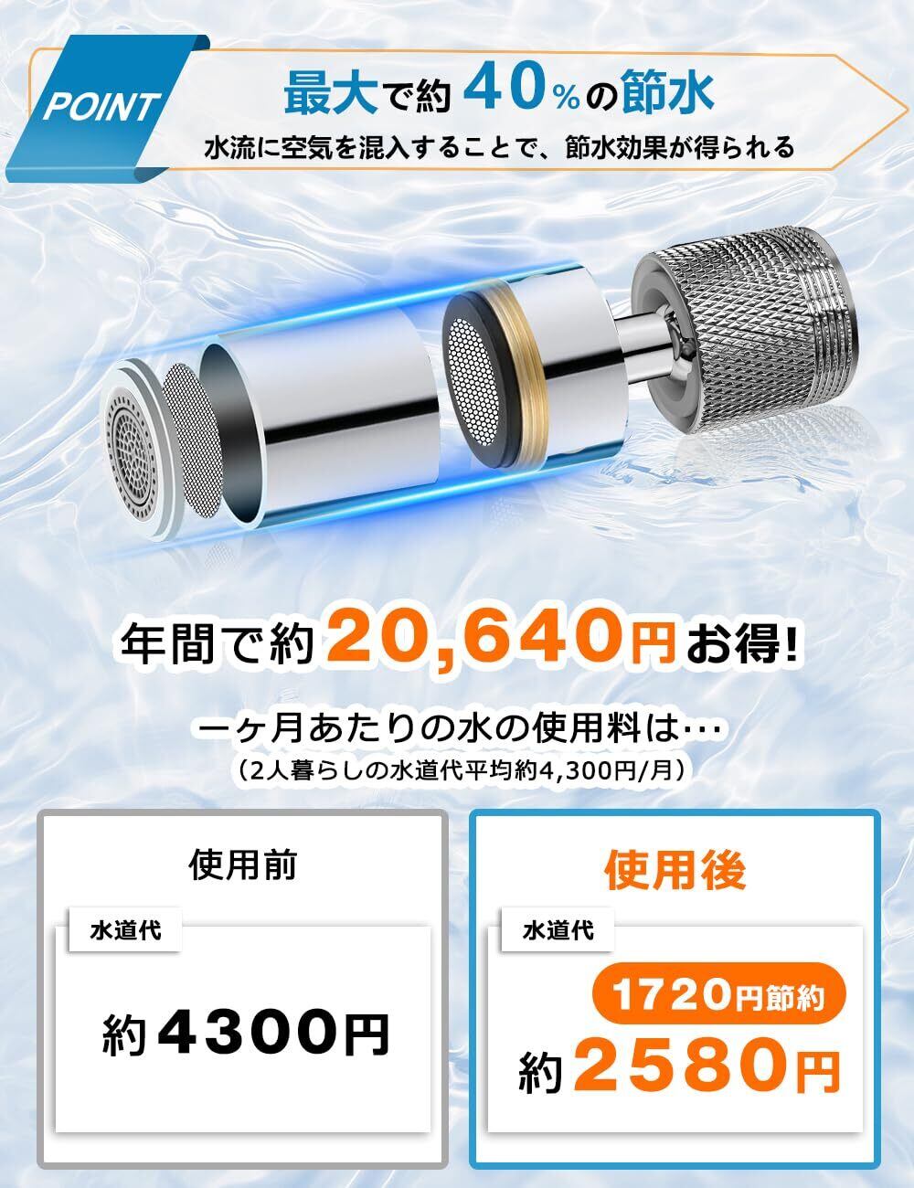 この蛇口シャワーには節水機能が備わっており、従来の蛇口と比べて水の使用量を大幅に減少させることができます。泡沫器により、水流がやわらかくなることで、手や食器、フロアなどに優しい使用感を実現しています。