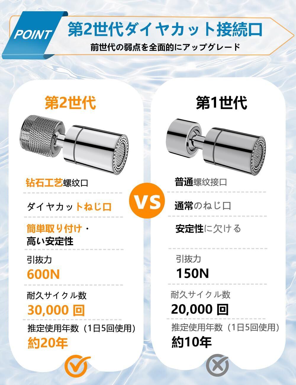 【進化した接続部 × 2モード水流で快適洗浄】このたび、水栓との接続部分に「ダイヤモンド調サンドブラスト加工」を新採用。従来品よりも表面硬度が約30%向上し、日常的な摩擦や水垢による劣化に強く、長期間美しい見た目と確かな密着性を維持します。さらに、本体には「シャワー/泡」の2種類の水流モードを搭載。ヘッド先端を軽く回すだけで、用途に応じて瞬時に切り替え可能。例えば、朝の忙しい時間帯に野菜を洗う際は「シャワーモード」で集中水流を使い、15秒で泥汚れを落とせます。一方、夕方の食器洗いでは「泡モード」を選択すれば、やわらかなミスト状の水流が油汚れを包み込み、水跳ねを90%以上カットしながらシンク周りを清潔に保てます。家族のライフスタイルに合わせて、水の使い方をスマートに変えられます。