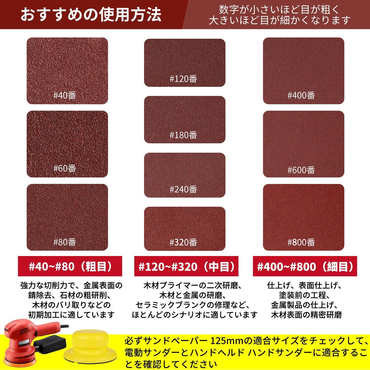 【ほとんどのDIY作業に適した完全なセット】50枚サンダー ペーパーセット 粗目から細か目まで (#40/#60/#80/#120/#180/#240#/#320/#400/#600/#800 各5枚)、ランダムサンダー ペーパー背面に数字が印刷されており、数字が小さいほど粗目、大きいほど細目です