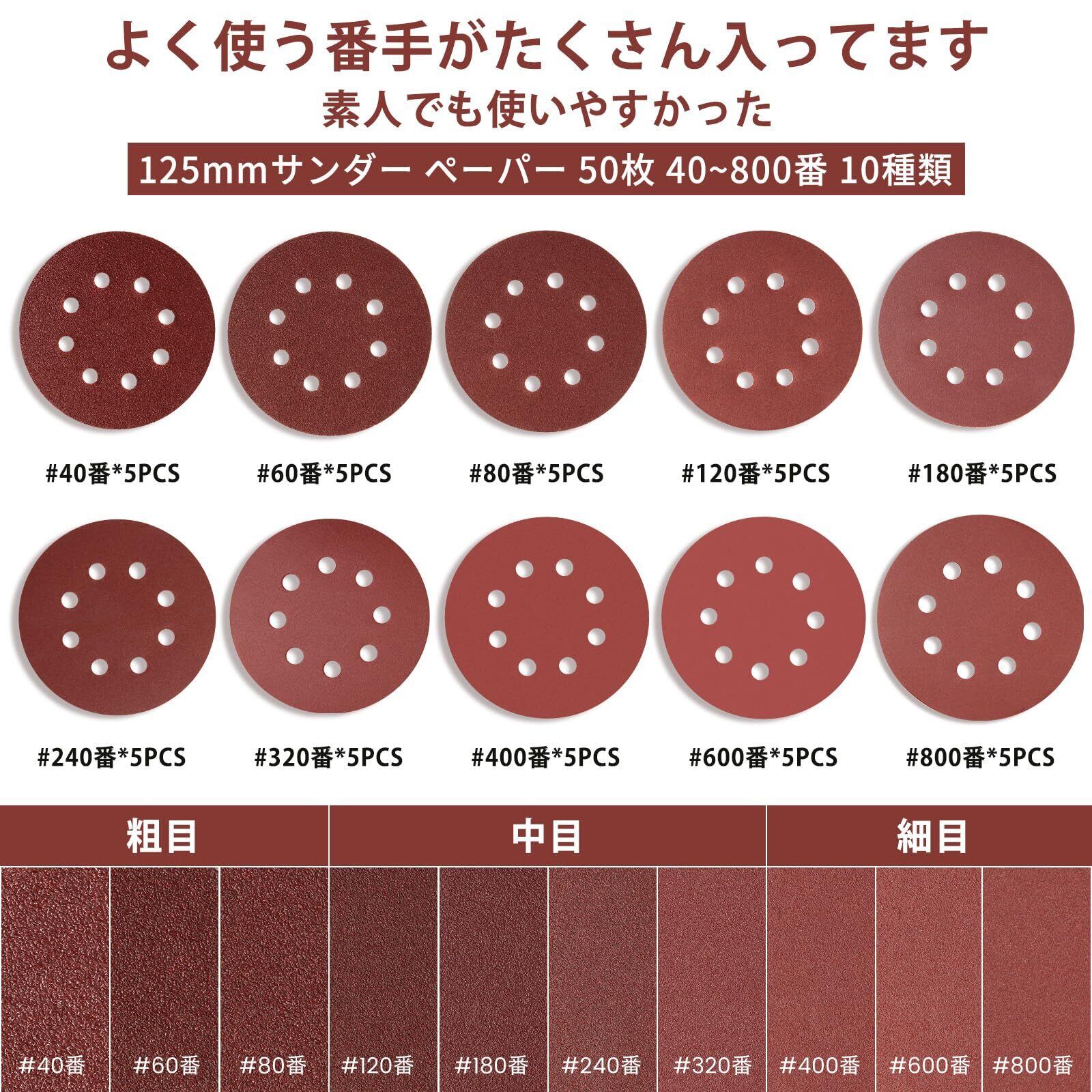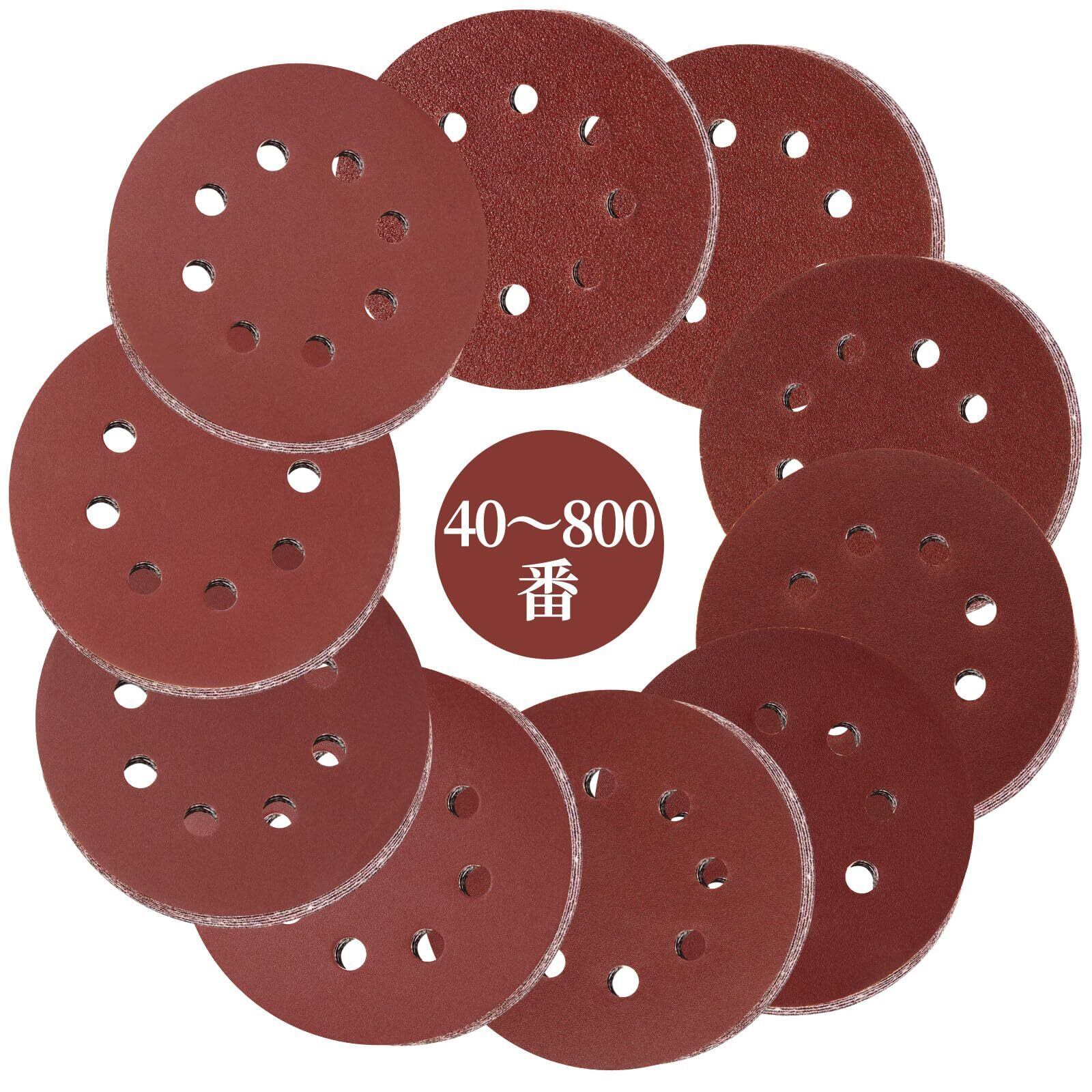 ランダムサンダー ペーパー 125mm サンドペーパー セット 40~800番 50枚入セット サンダー ペーパー マジック式 8穴 サンディングペーパー 丸型 サンディングディスク 電動サンダー用ディスクペーパー 木工DIY作業に 金属磨き 自動車整備 10種類 40 60 80 120 180 240 320 400 600 800 各5枚