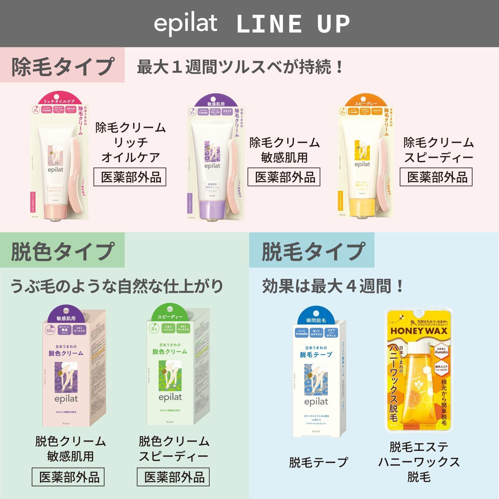 ●40年むだ毛処理剤を製造販売している確かな日本品質。●お肌保護成分1.5倍【エピラット従来品比(除毛クリーム 敏感肌用・スピーディー、脱色クリーム 敏感肌用のみ)】配合。肌をいたわりながらむだ毛処理。●むだ毛をうぶ毛みたいに目立たなく。●医薬部外品