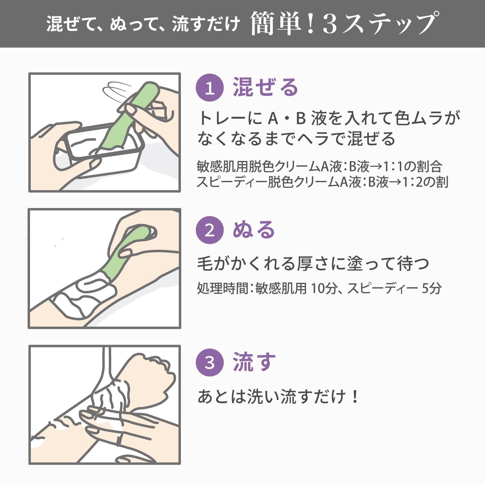 ①専用トレーにA液とB液を1:1の割合で約20gずつ入れ、色ムラがなくなるまでよく混ぜます。この分量で両腕全体または両足(ひざ下)の脱色ができます。(トレーには20gごとに目盛り線が入っています。)※混合液はその都度作ってください。※混合後のクリームは放置せず、すぐにご使用ください。効果に影響します。②脱色する部分に、ヘラでクリームを毛がかくれる厚さにぬります。そのまま10分程おいてから、一部分をふきとり、効果を確認します。脱色効果が不十分な場合は、更に5分程放置します。※最初の放置から、合計15分以上は使用しないでください。指定時間以上お使いになると皮フに一時的に炎症が生じる場合があります。万一炎症が生じた場合は、冷たいタオルで冷やしてください。③脱色後は水かぬるま湯でよく洗い流してください。※洗い流す際、石けん類・ボディブラシなどは肌に刺激となりますので使用しないでください。④足など毛が濃くて1回で脱色しきれなかった場合は、合計15分以上放置せずに洗い流し、1日おいてからもう一度お使いください。