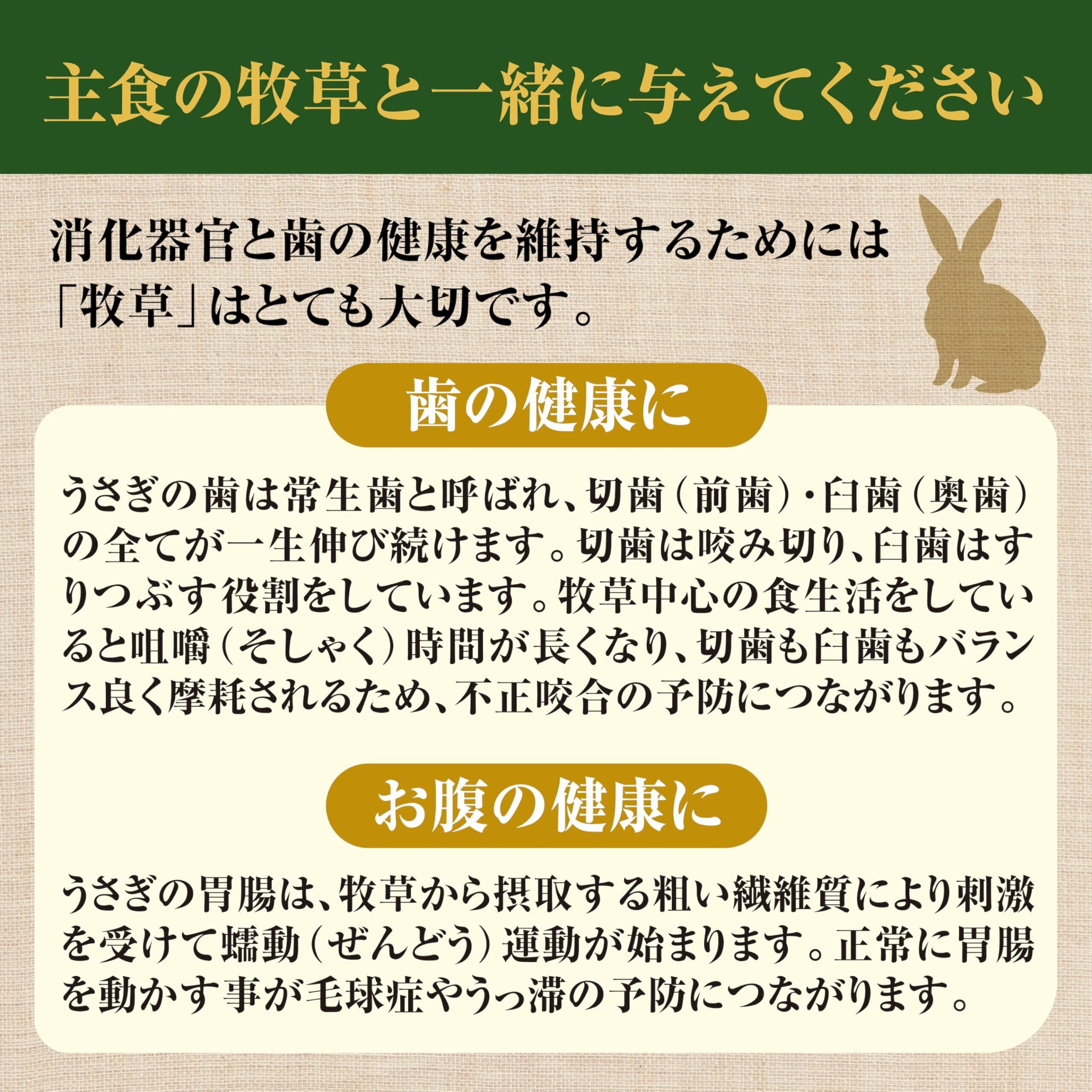 【与え方】主食である牧草はいつでも食べられるように与え、本製品は1日の給餌量を体重の5%を目安に、朝夕2回に分けて与えてください。初めて本製品に切り替える場合は、現在与えているペレットフードに最初は少量を混ぜ、徐々に混ぜる量を増やして切り替えてください。新鮮な水をいつでも飲めるような状態にしてください。※うさぎの品種や個体差、牧草の種類や品種、他に与えられている野菜やおやつの量によって、本製品を与える量は増減しますので、うさぎの体重やうんちなどを観察しながら適量を与えてください。※仔うさぎの場合は、生後7週間を境に少しずつ与えてください。※食べ残しは腐敗の原因になりますので取り除いてください。