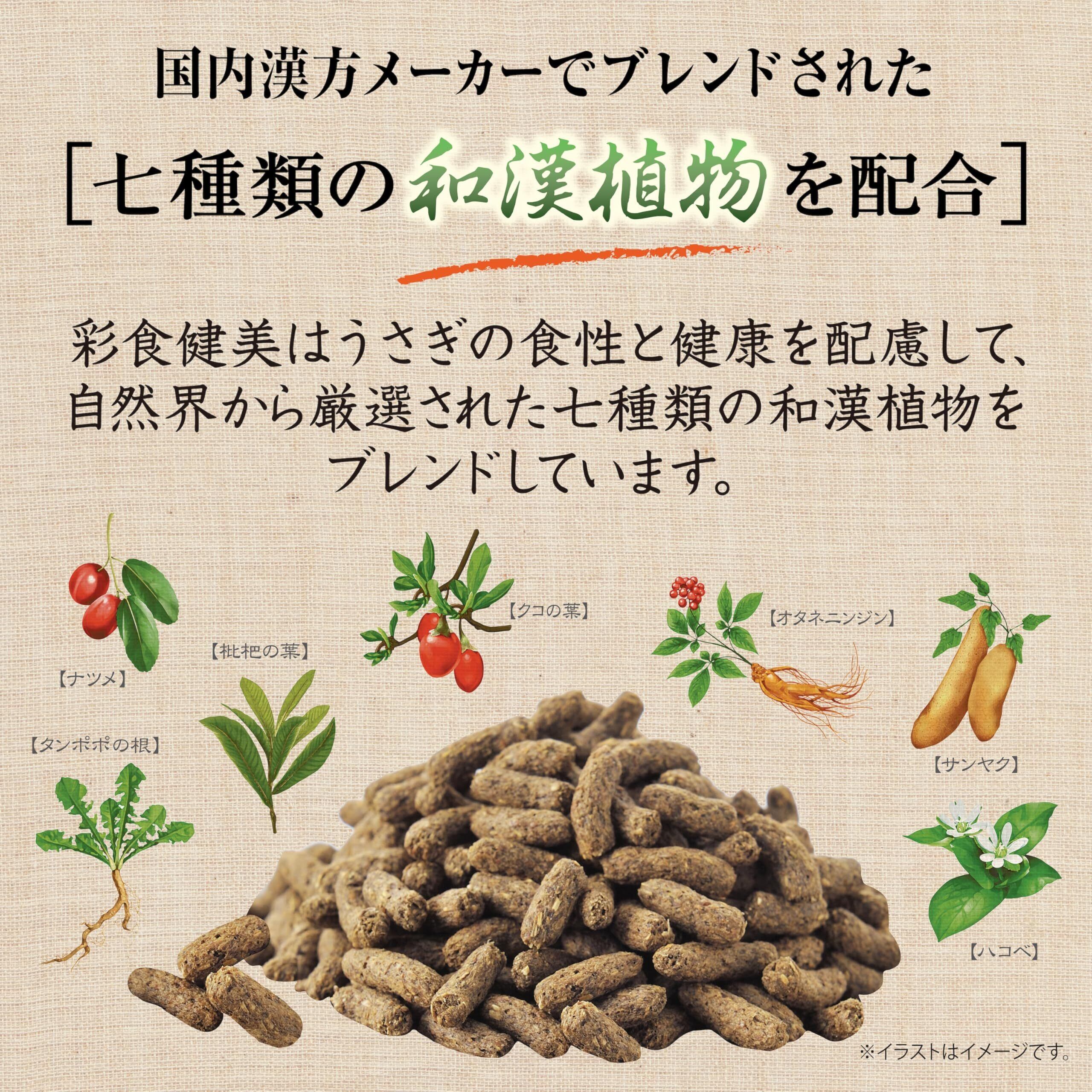 【国内漢方でブレンドされた7種類の和漢植物を配合】彩食健美はうさぎの食性と健康を配慮して、自然界から厳選された7種類の和漢植物をブレンドしています。